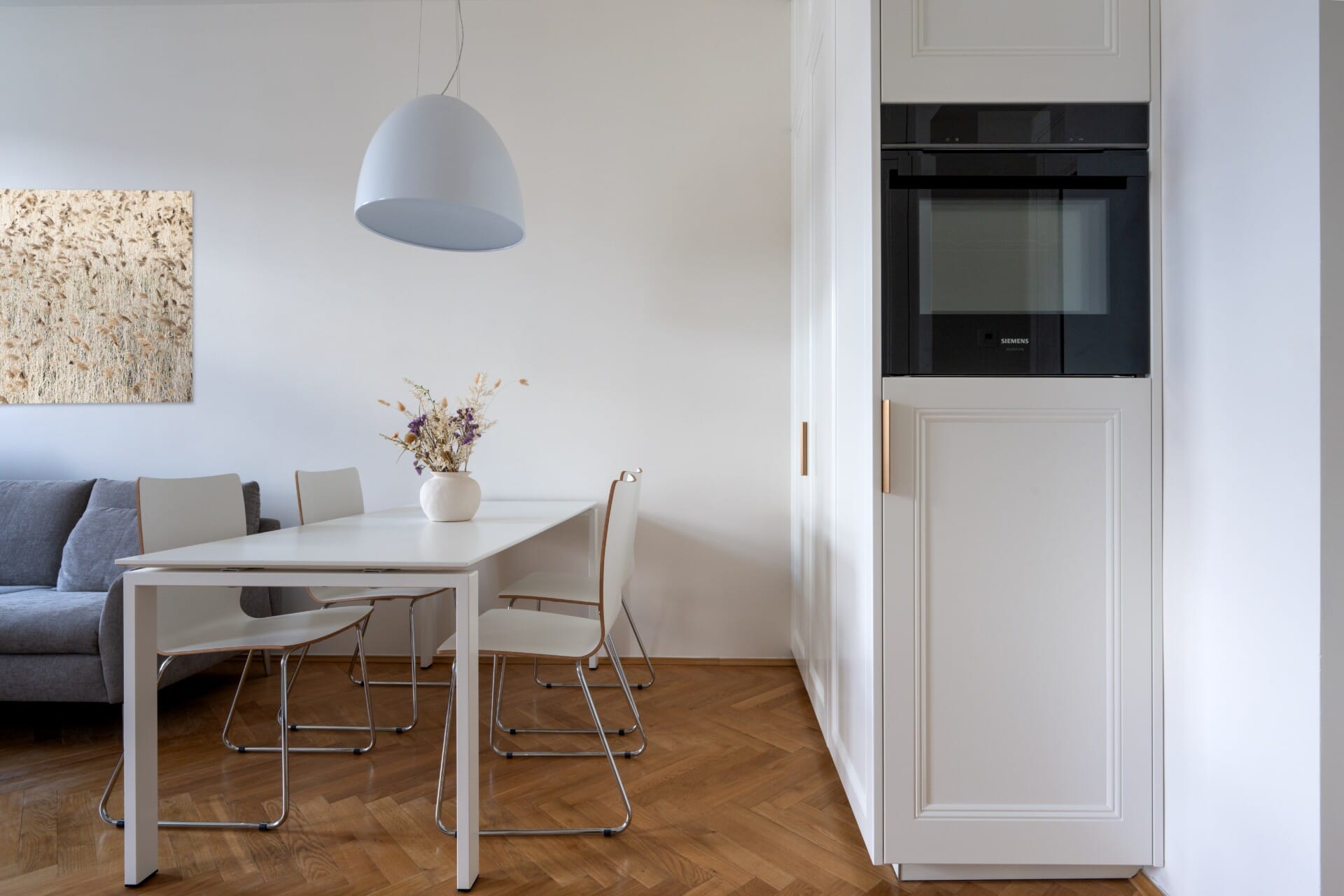 Investor preferoval interiér laděný do původního klasického stylu vinohradských činžovních domů, proto jsme zachovali tradiční prvky a kombinovali je s moderními technologiemi a materiály. Kuchyňský nábytek dodal renomovaný německý výrobce Eggersmann.