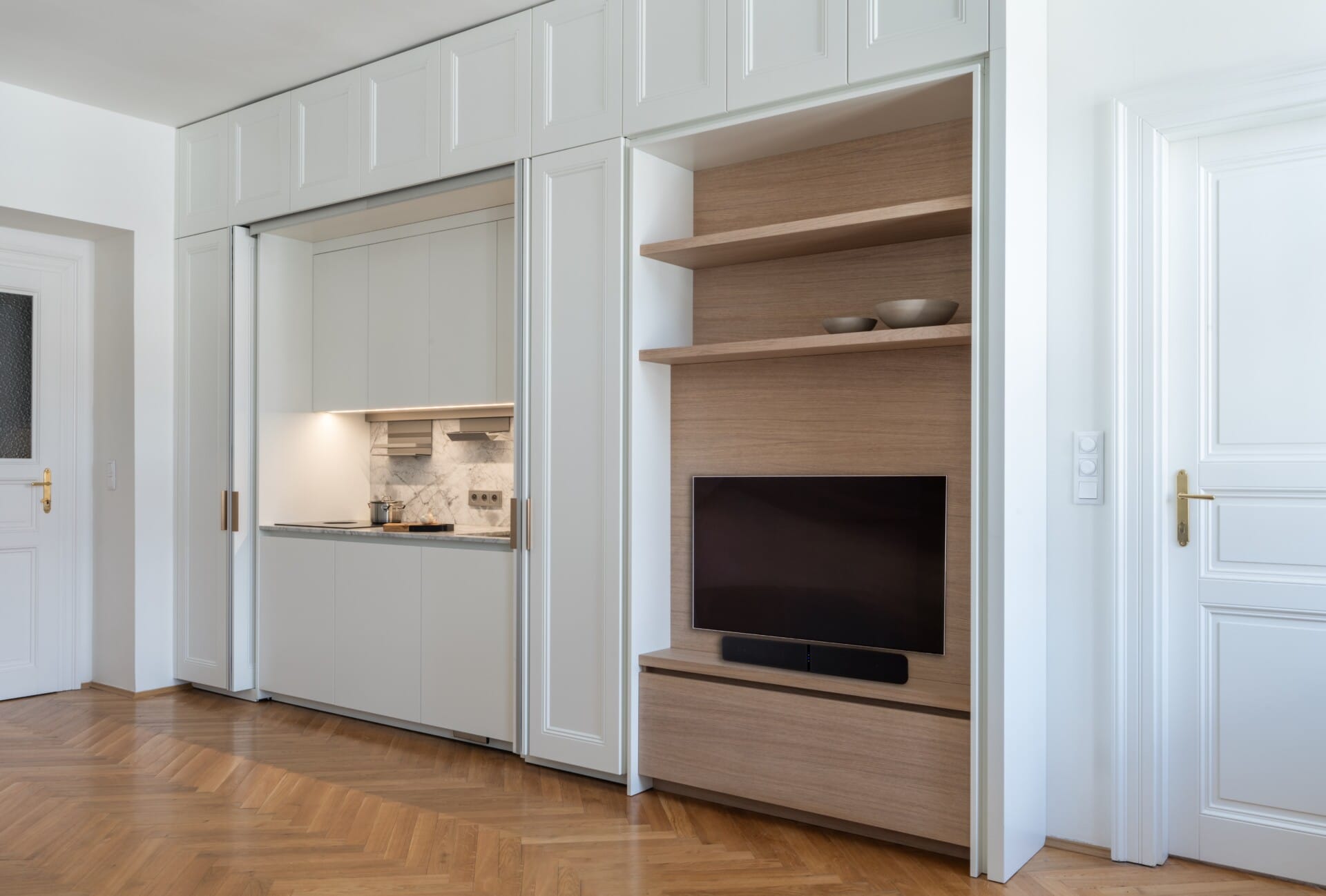 Pro investora, expata pracujícího v Praze, jsme navrhli kuchyni splňující náročné požadavky na variabilitu. Hlavním přáním klienta bylo vytvořit prostor, který se snadno transformuje v obývací místnost. To vedlo k návrhu kuchyňské sestavy, která plynule přechází v nábytkovou stěnu s televizí, audiotechnikou a knihovnou.