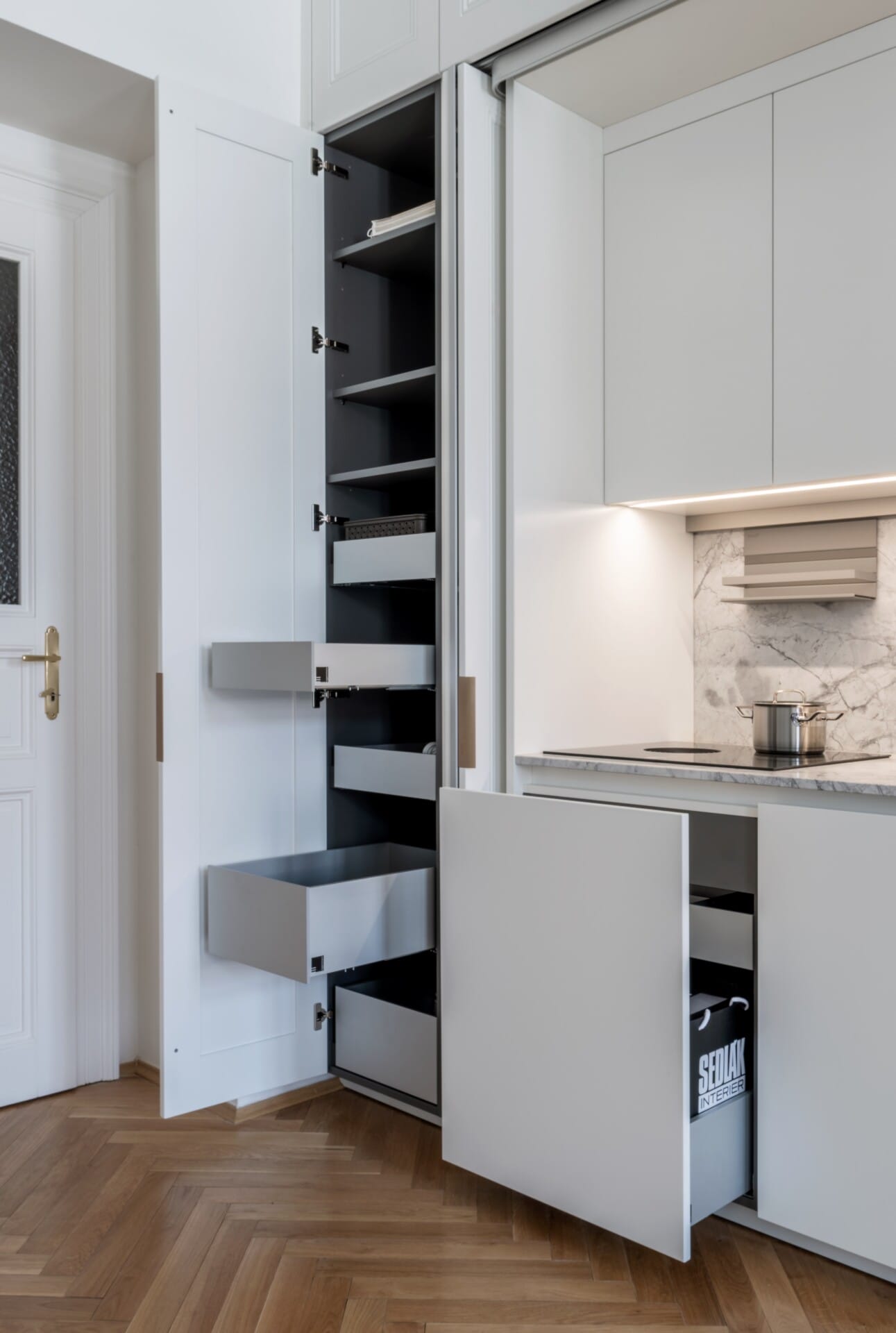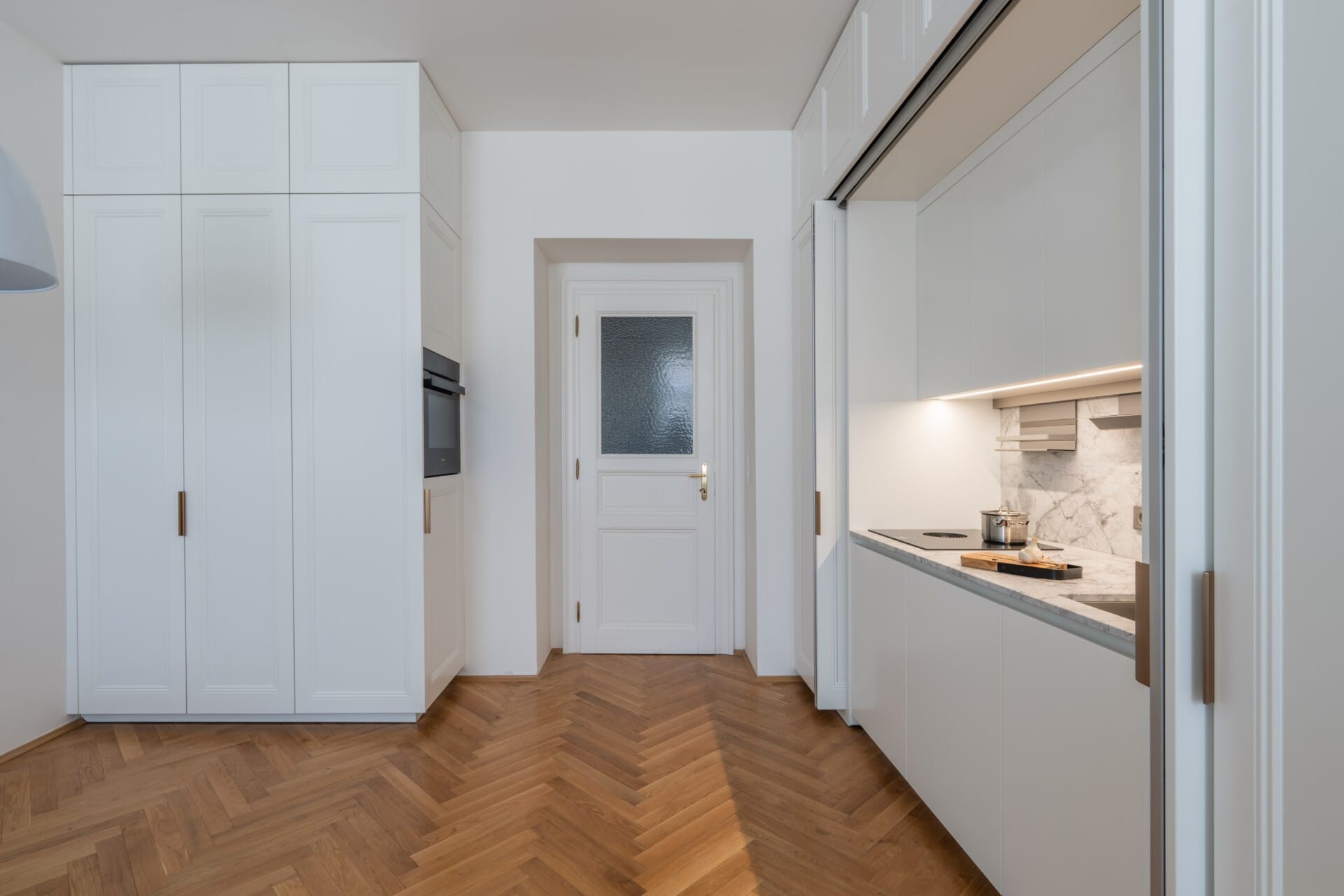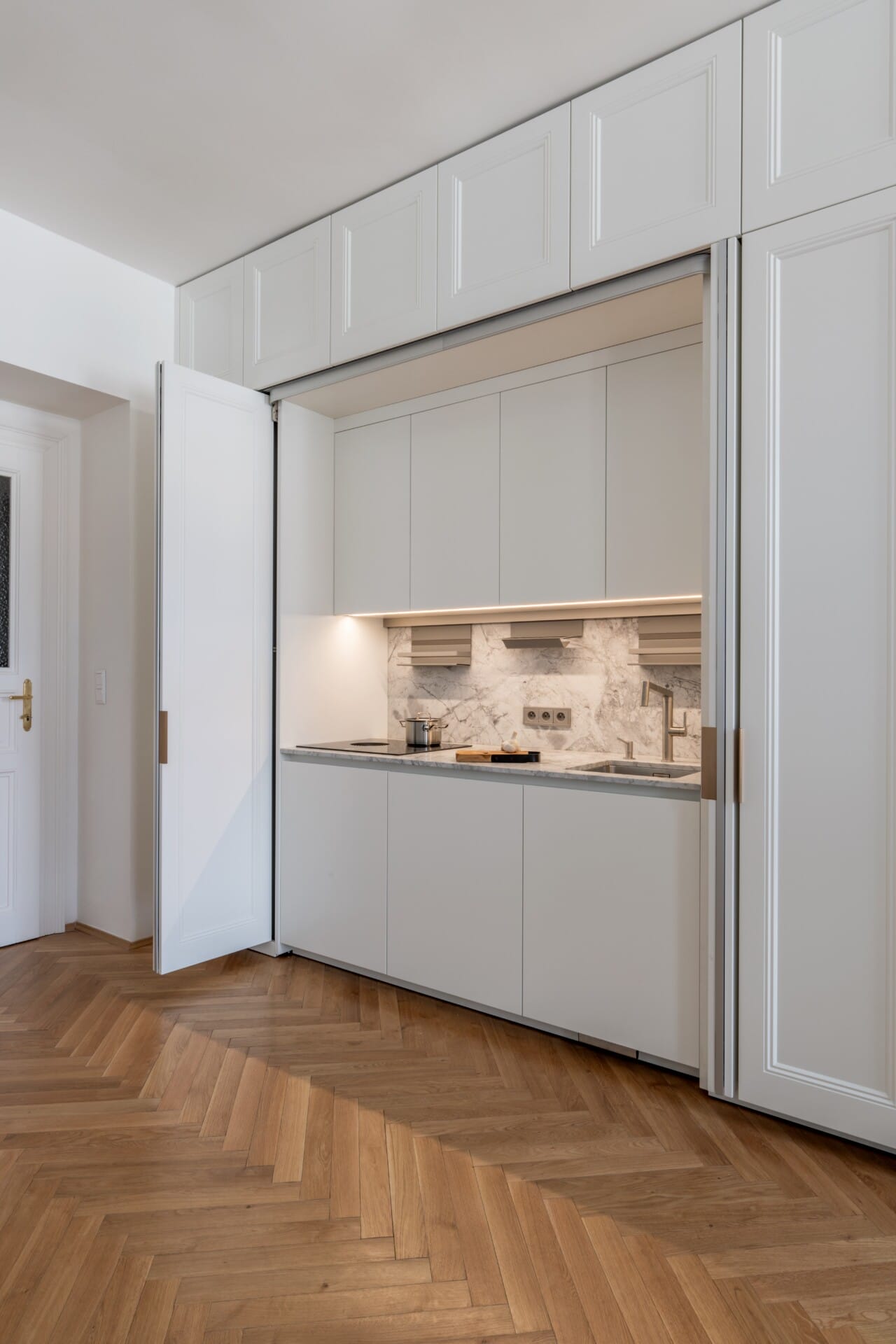 Design kombinuje matný bílý lak na rámečkových panelech s kvarcitovou deskou Quartzite Bianco Nuvola. Unikátní čtyřkřídlé posuvně otočné dveře Hawa Folding Pocket Doors umožňují schování kuchyňské linky, čímž vytvářejí čistou, kompaktní plochu.