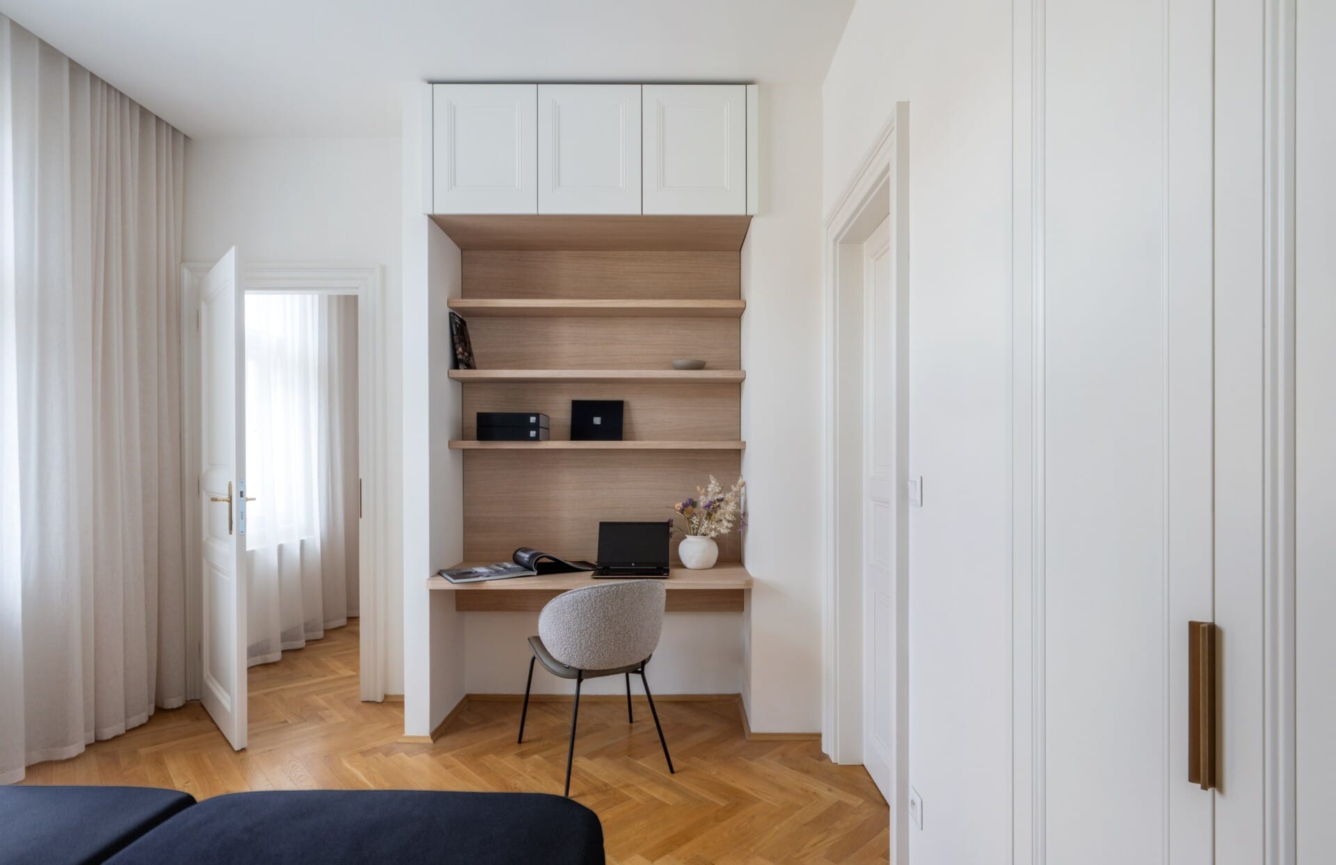 Rafinovaná práce s nikami v malém bytě zaujala porotu svou promyšleností a elegancí. Čistá a vyvážená kompozice skvěle ladí s architekturou vinohradského činžovního domu. V omezeném prostoru se podařilo vytvořit kompaktní a funkční interiér, který působí vzdušně a uceleně.