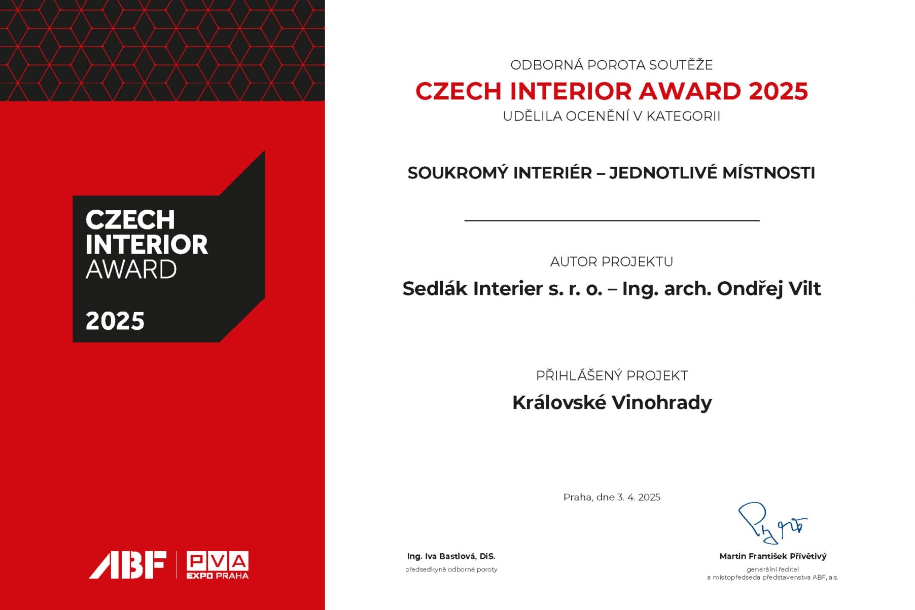 Projekt „Královské Vinohrady“ získal v roce 2025 ocenění Czech Interior Award v kategorii „Soukromý Interiér – jednotlivé místnosti“.