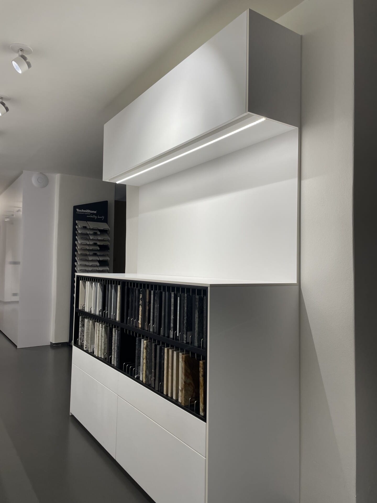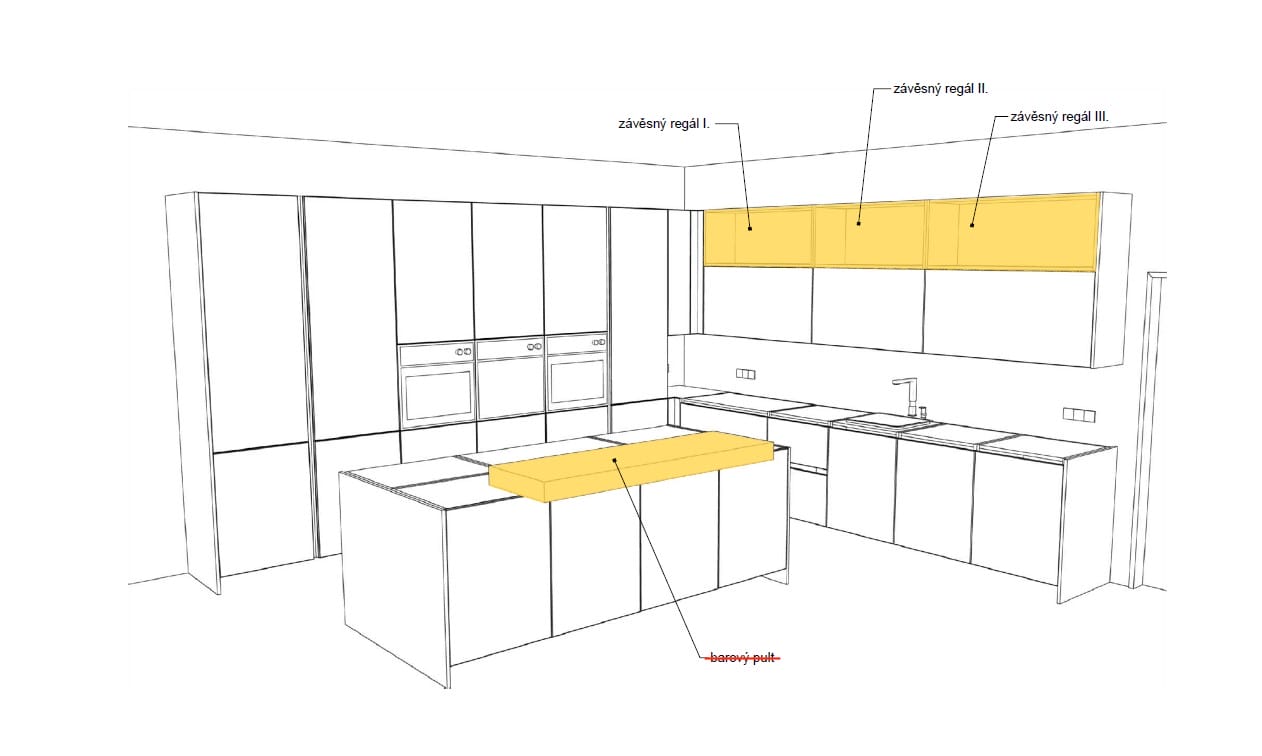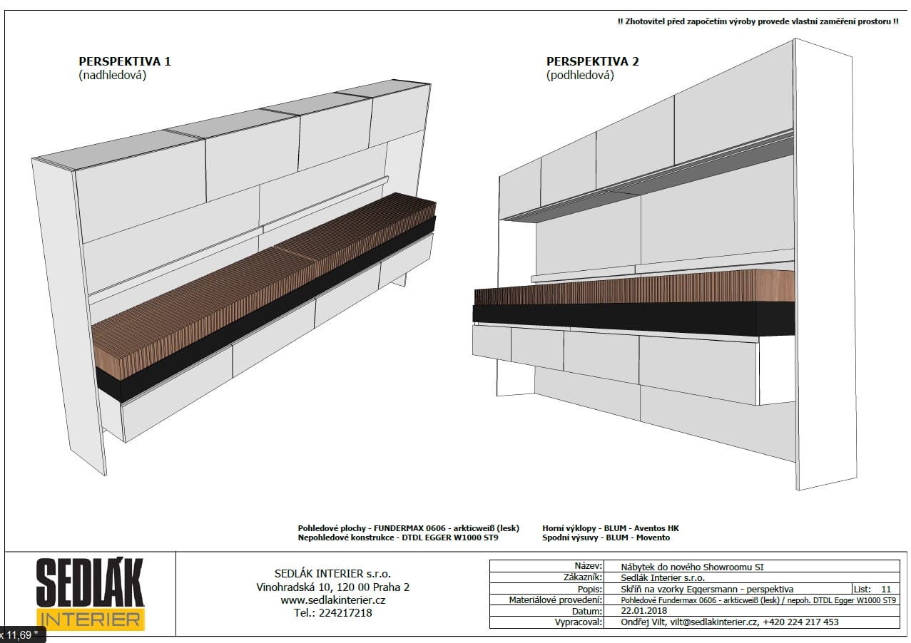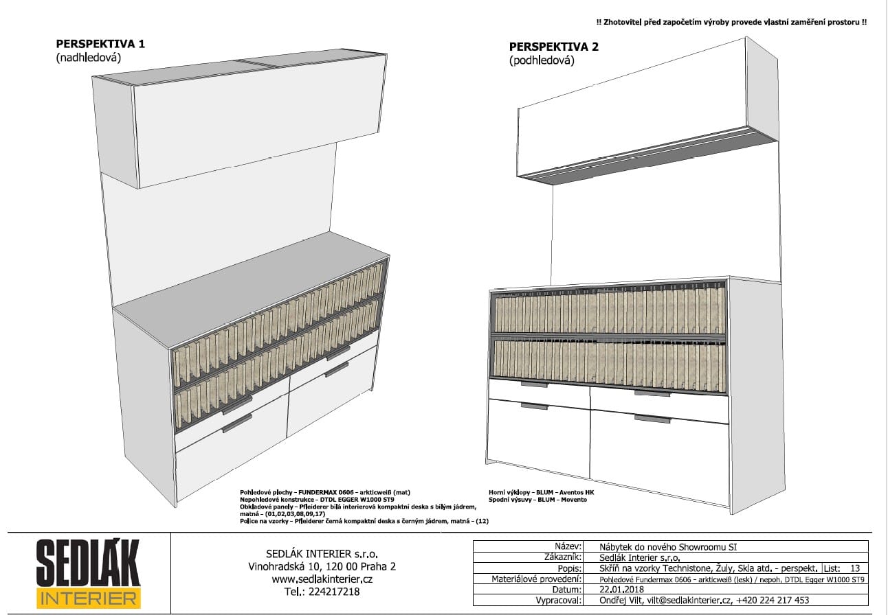 Pohledové plochy melamin Fundermax 0606 mat, nepohledové konstrukce DTDL Egger W1000 ST9, pracovní deska a obklad HPL kompaktní deska Pfleiderer bílá mat s probarveným jádrem.