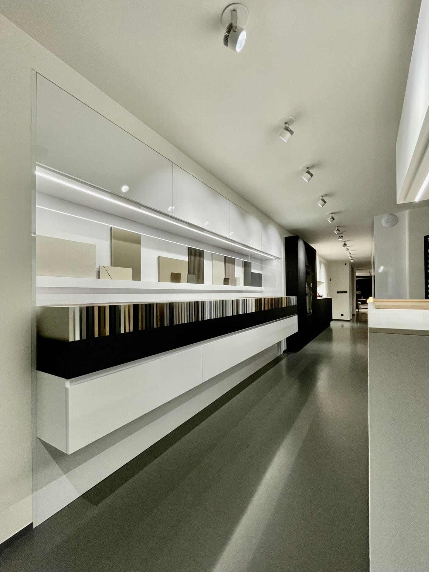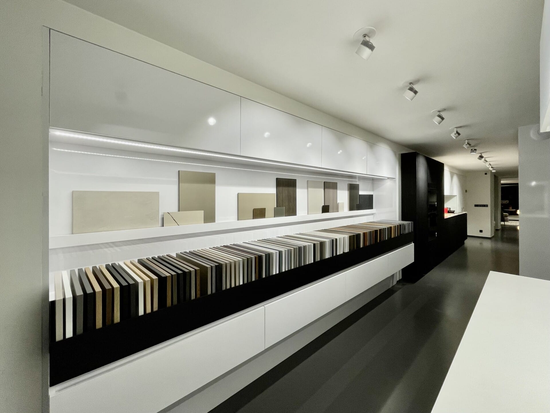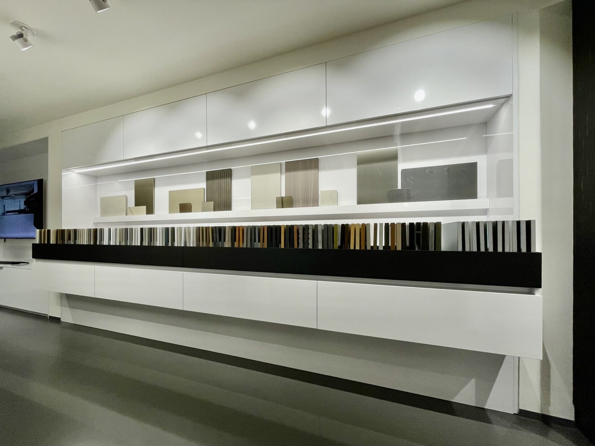 Pohledové plochy melamin Fundermax 0606 mat, nepohledové konstrukce DTDL Egger W1000 ST9, pracovní deska a obklad HPL kompaktní deska Pfleiderer bílá mat s probarveným jádrem.