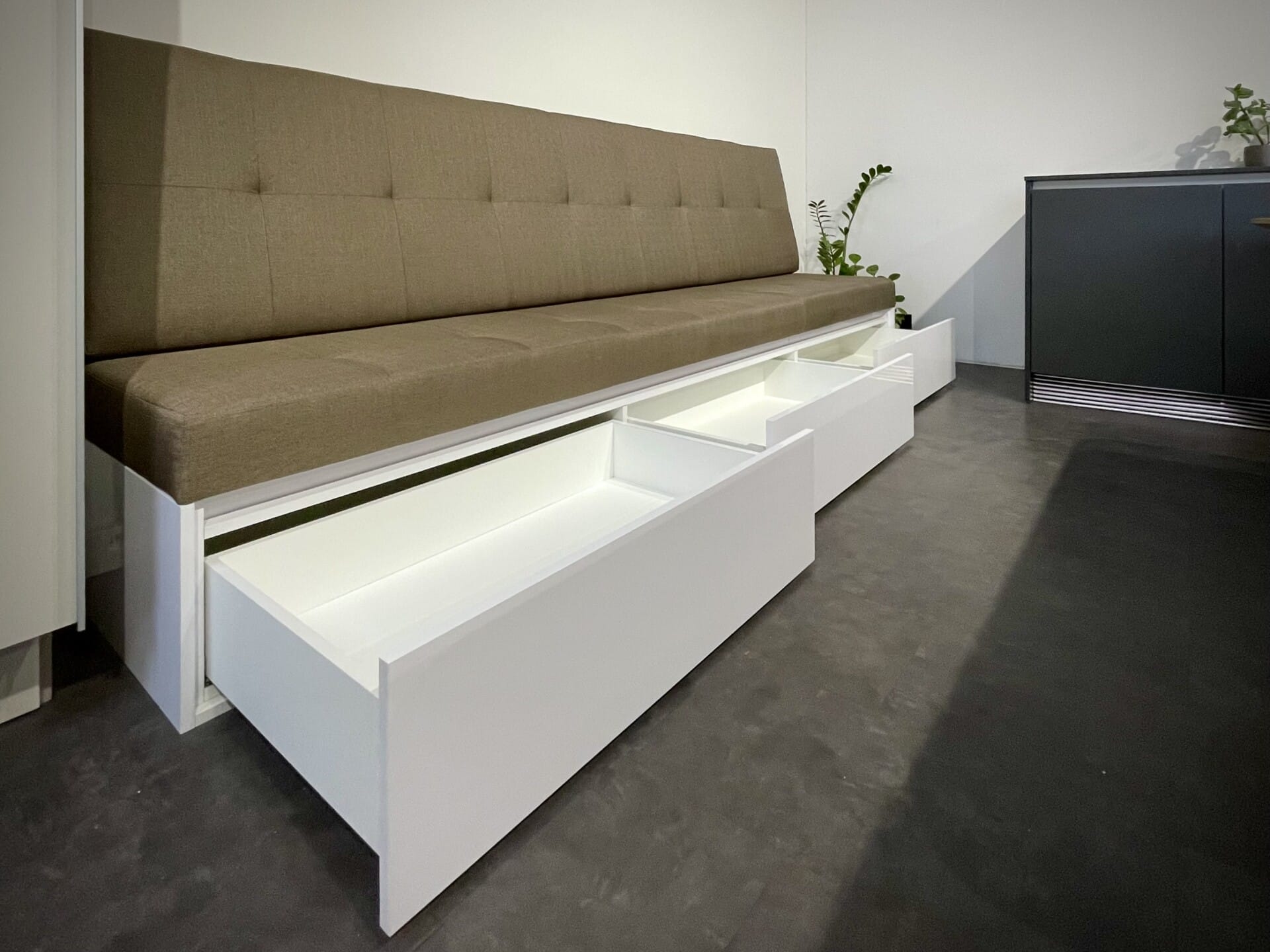 Atypický truhlářský nábytek – polstrovaný sedák a opěrák, úložný prostor se třemi výsuvy