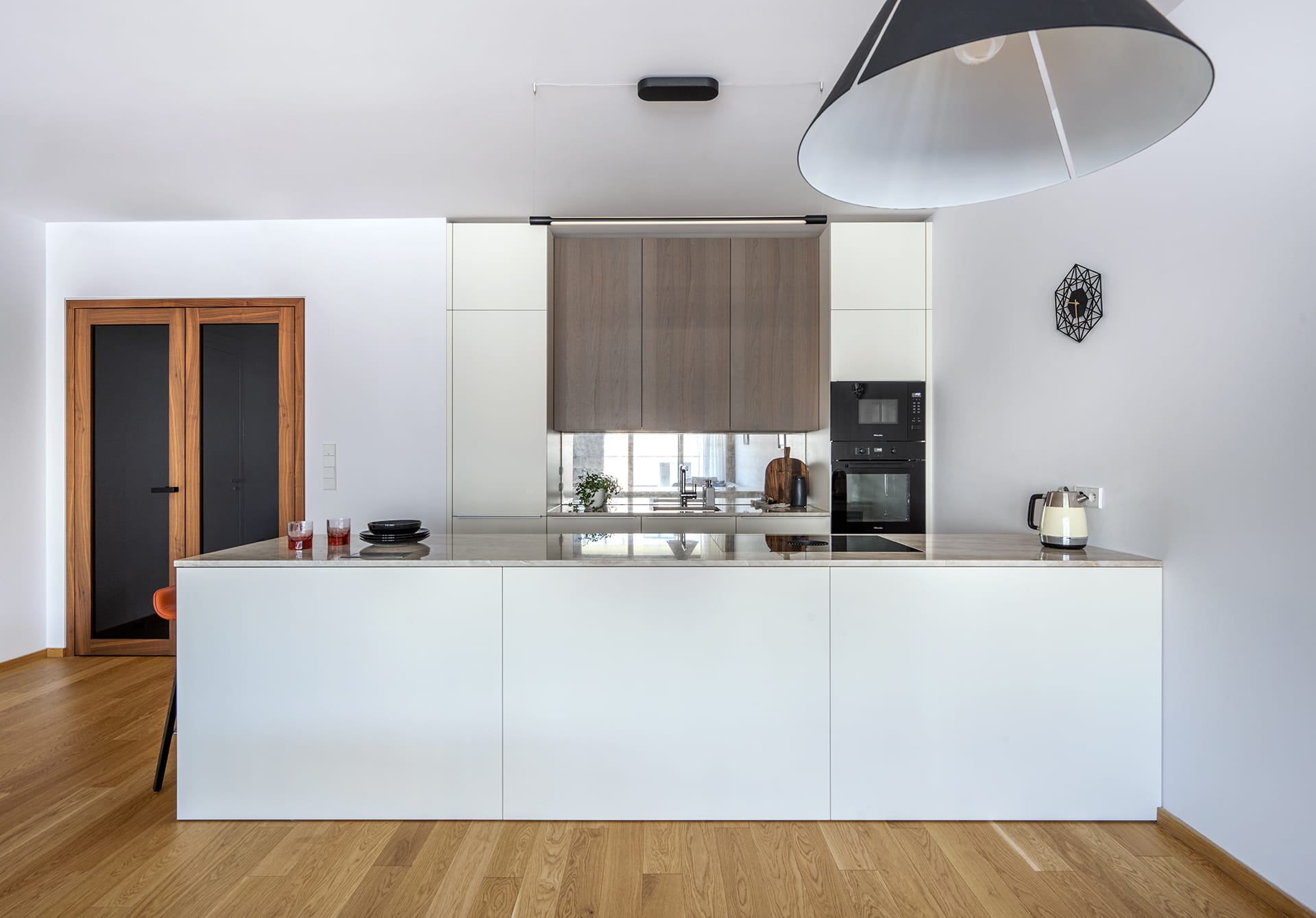Provedení matný lak blossom white matt a ořechová dýha. Pracovní deska Kvarcit Taj Mahal. Barová židle KFF Maverick. Spotřebiče BORA, Miele Küppersbusch, Liebherr a doplňky Blanco.