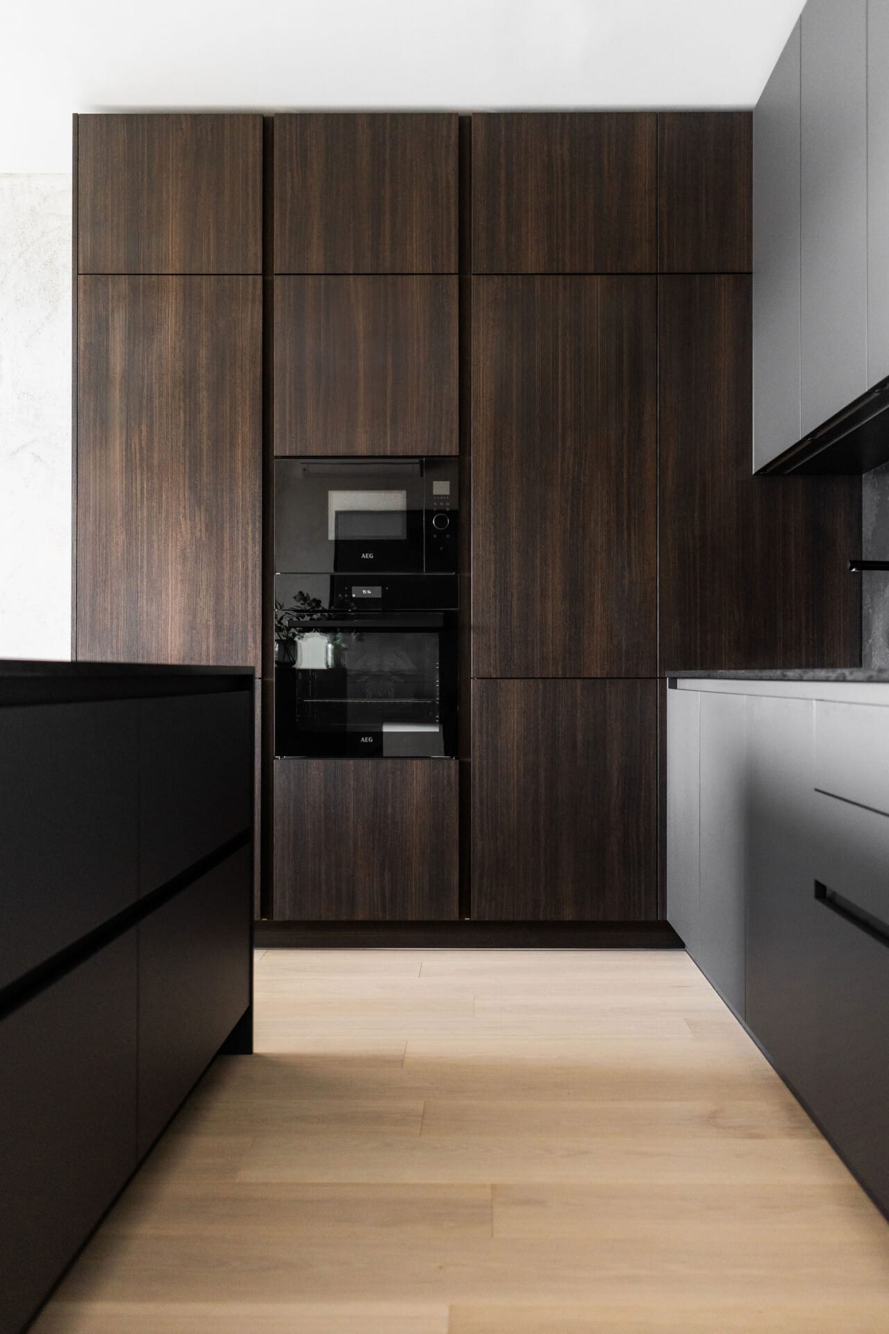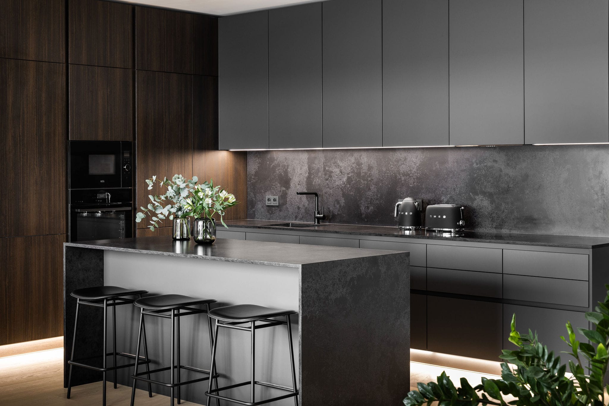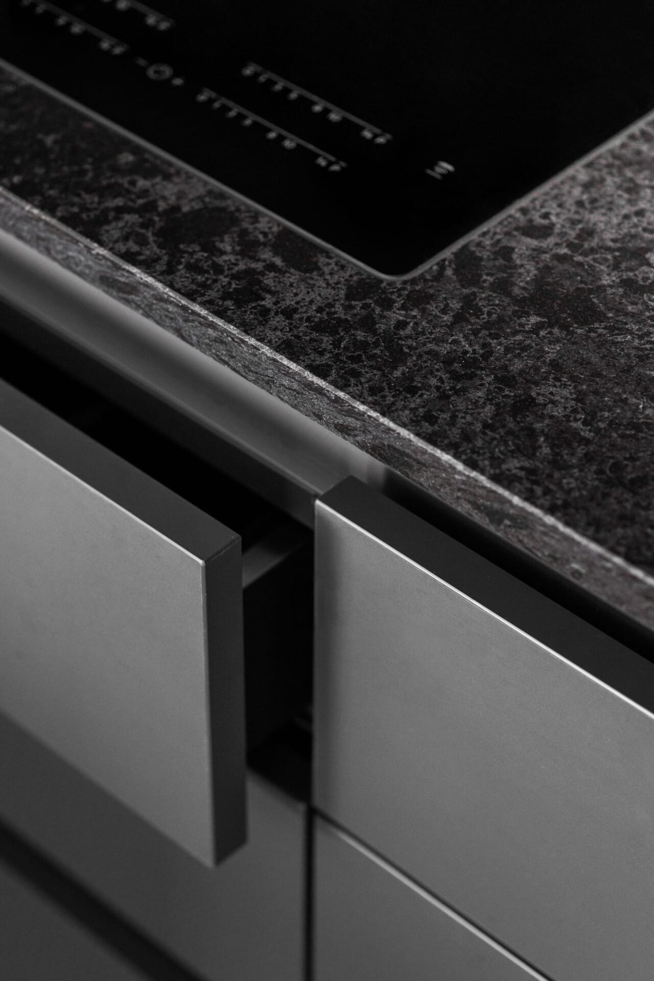 Pracovní deska TECHNISTONE Metropole Nero, 20 mm, mat. Spotřebiče AEG, chladnička Liebherr. Doplňky Blanco.