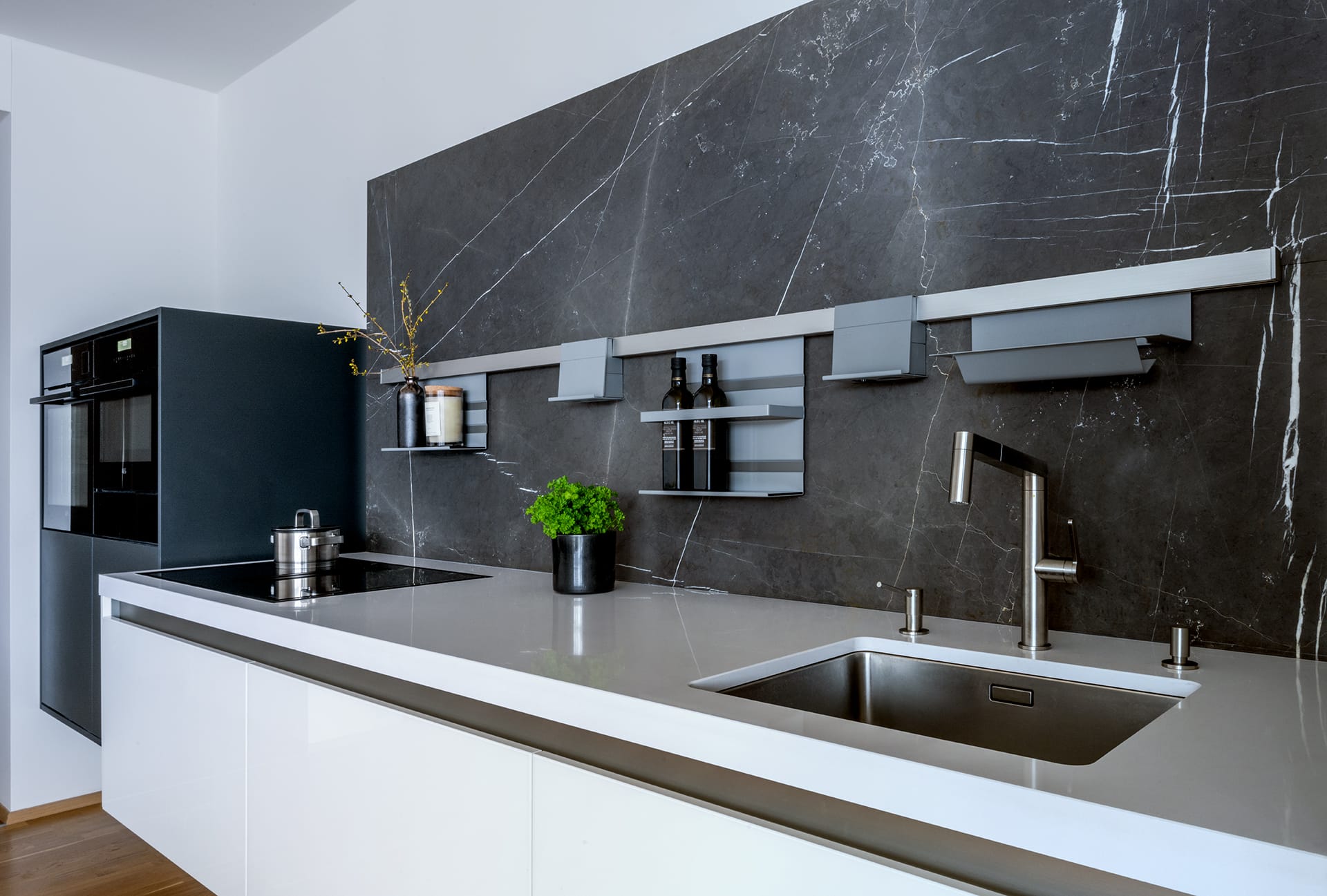 Provedení Cystal 5012 akrylové sklo A025 White. Pracovní deska. Technistone Absolute White. Obklad Graphit Brown. Spotřebiče: Siemens, AEG a doplňky Blanco, Kessebohmer.