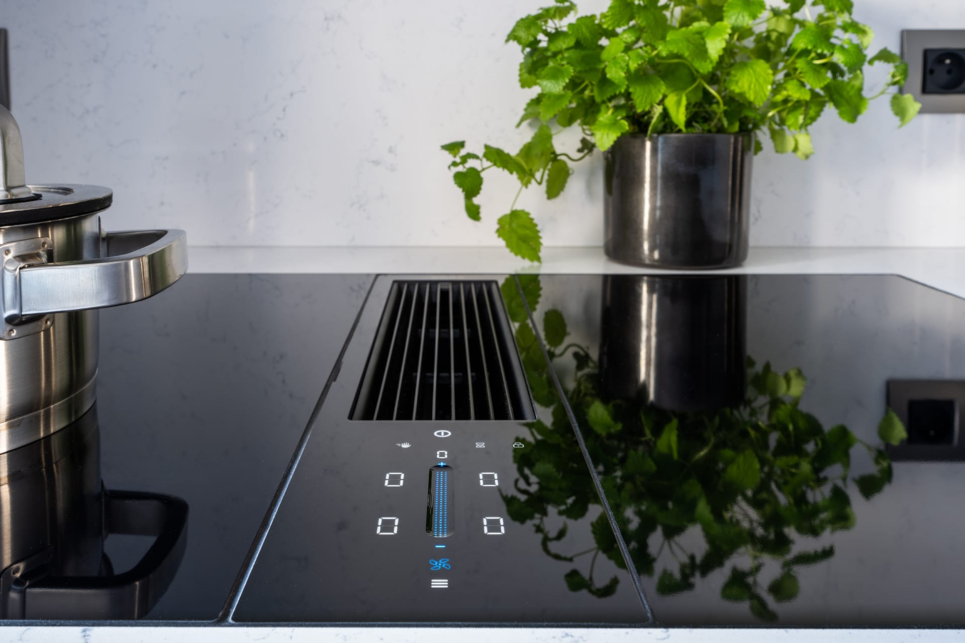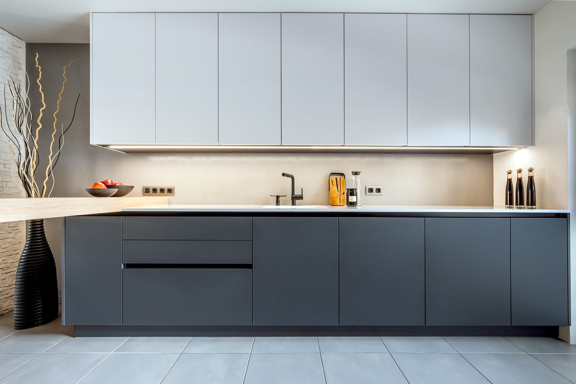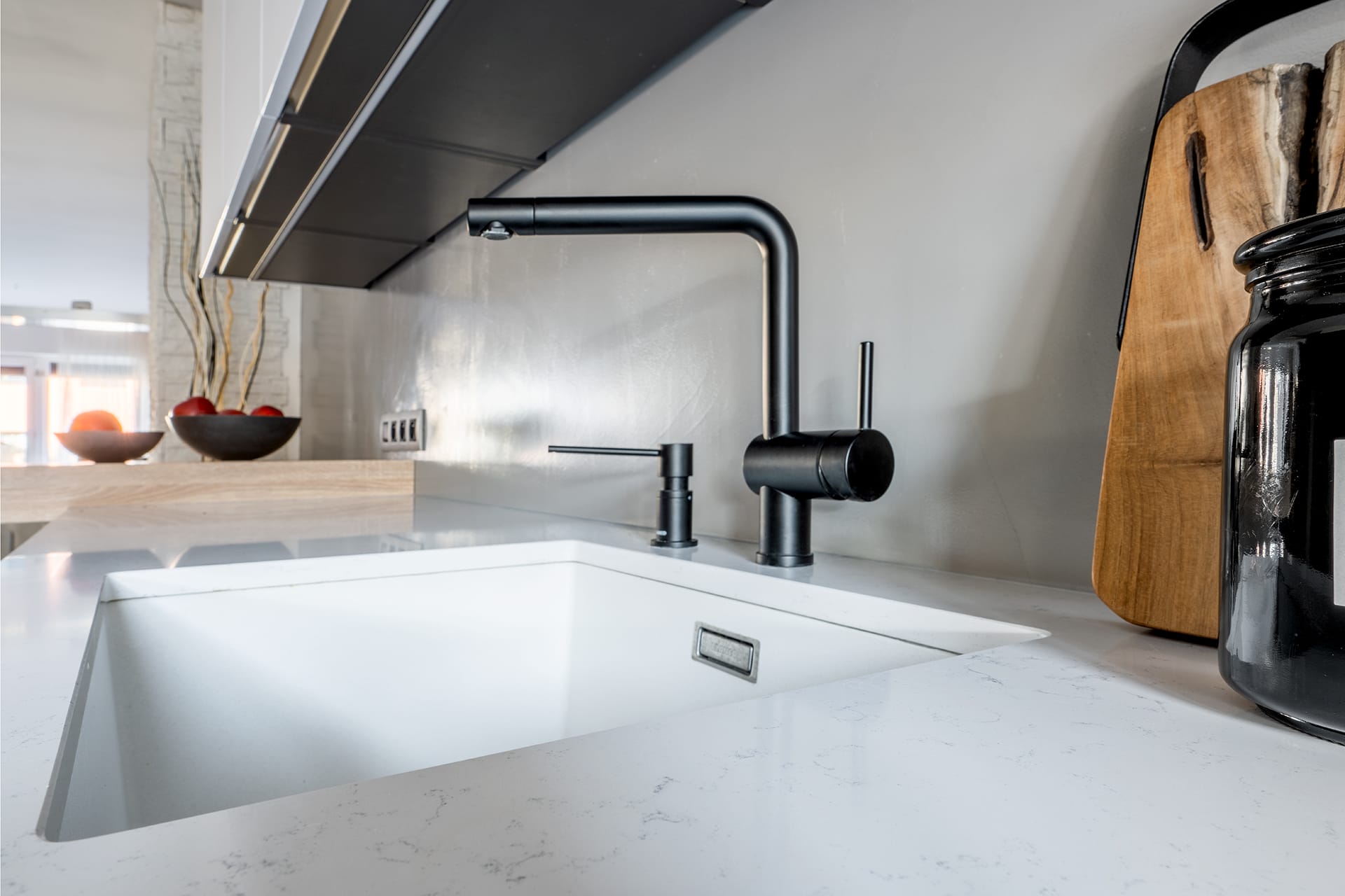 Provedení Ideal XT, na stěně omyvatelná cementová stěrka. Pracovní deska Technistone Noble areti bianco. Spotřebiče Liebherr, Miele a Bora. Doplňky Blanco.