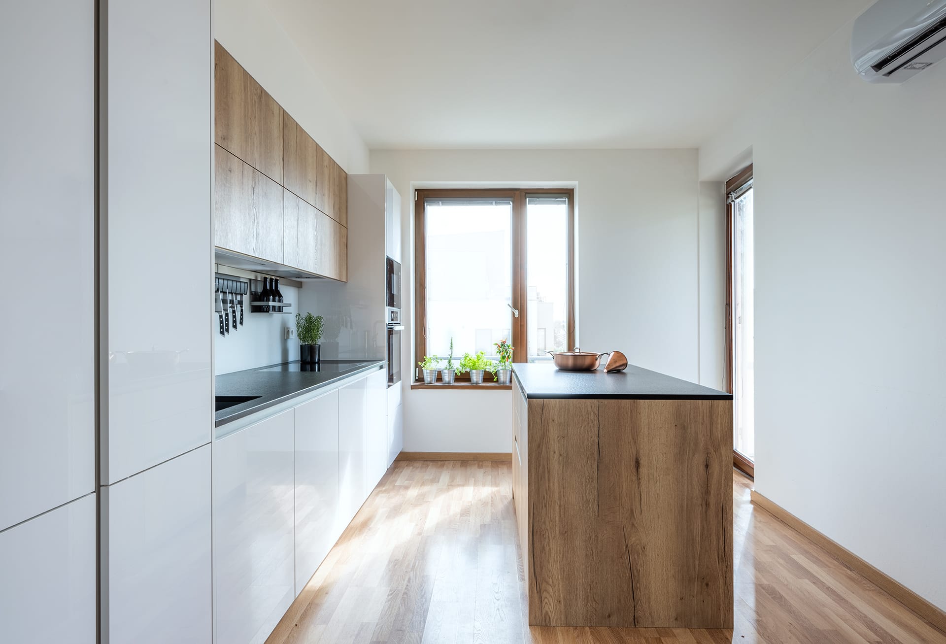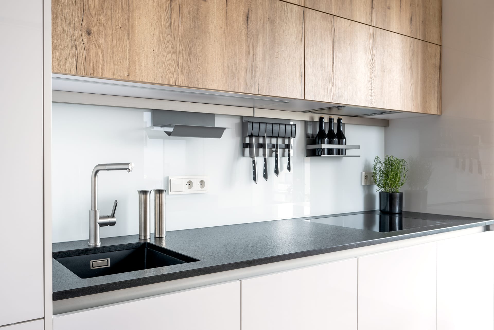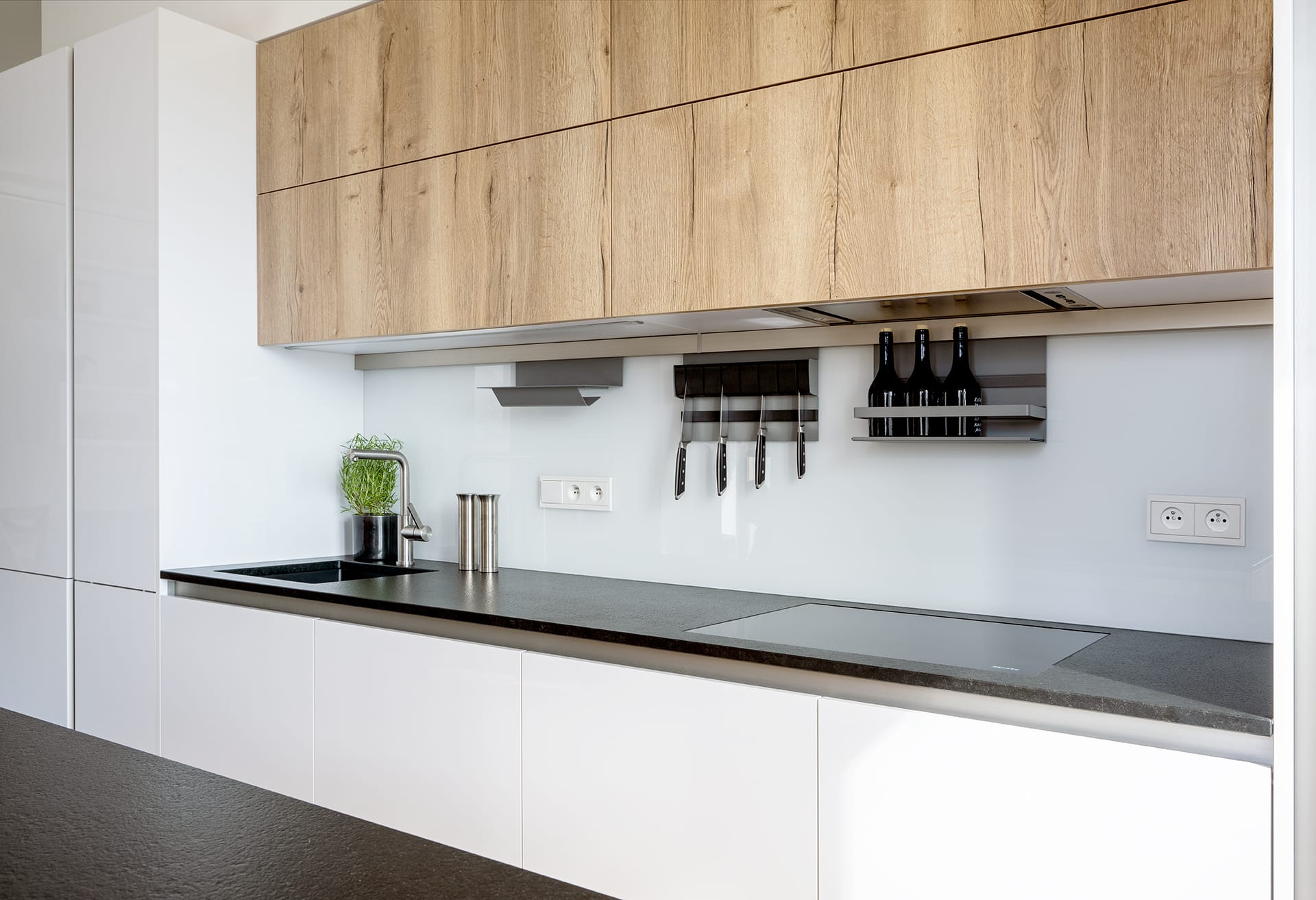 Provedení lak vysoký lesk Alpine white a lamino s 3D efektem a dřevěnou strukturou oak natural. Bezúchytkový systém nerez ocel. Pracovní deska žula Nero Assoluto Zimbabwe 2,0 cm, povrchová úprava patina/antik. Spotřebiče Miele, Siemens, Bosch a Novy, doplňky Blanco, Berker, Linero MosaiQ.