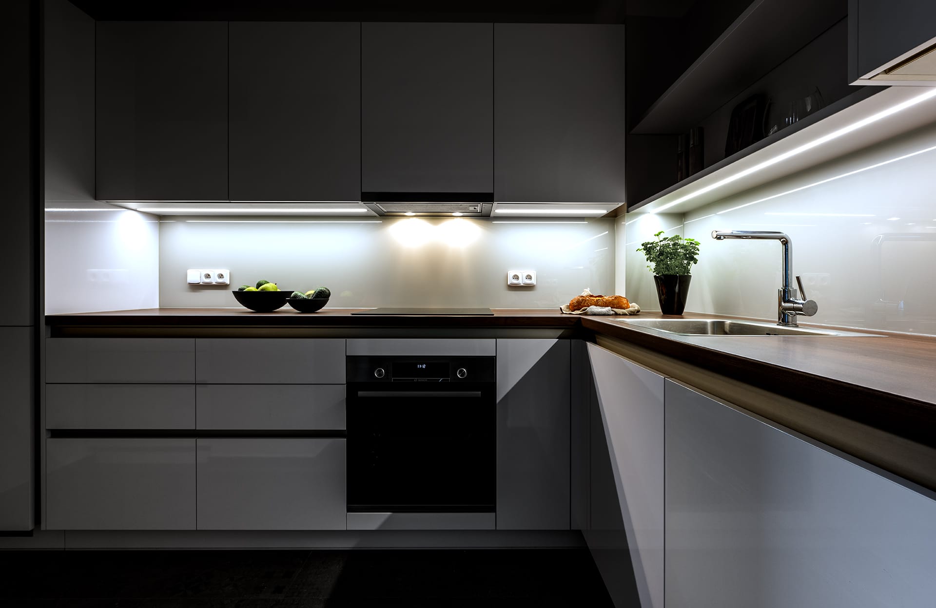 Svítidlo Diva se zapuštěnou montáží. Spotřebiče Bosh, a Liebherr. Doplňky Blanco