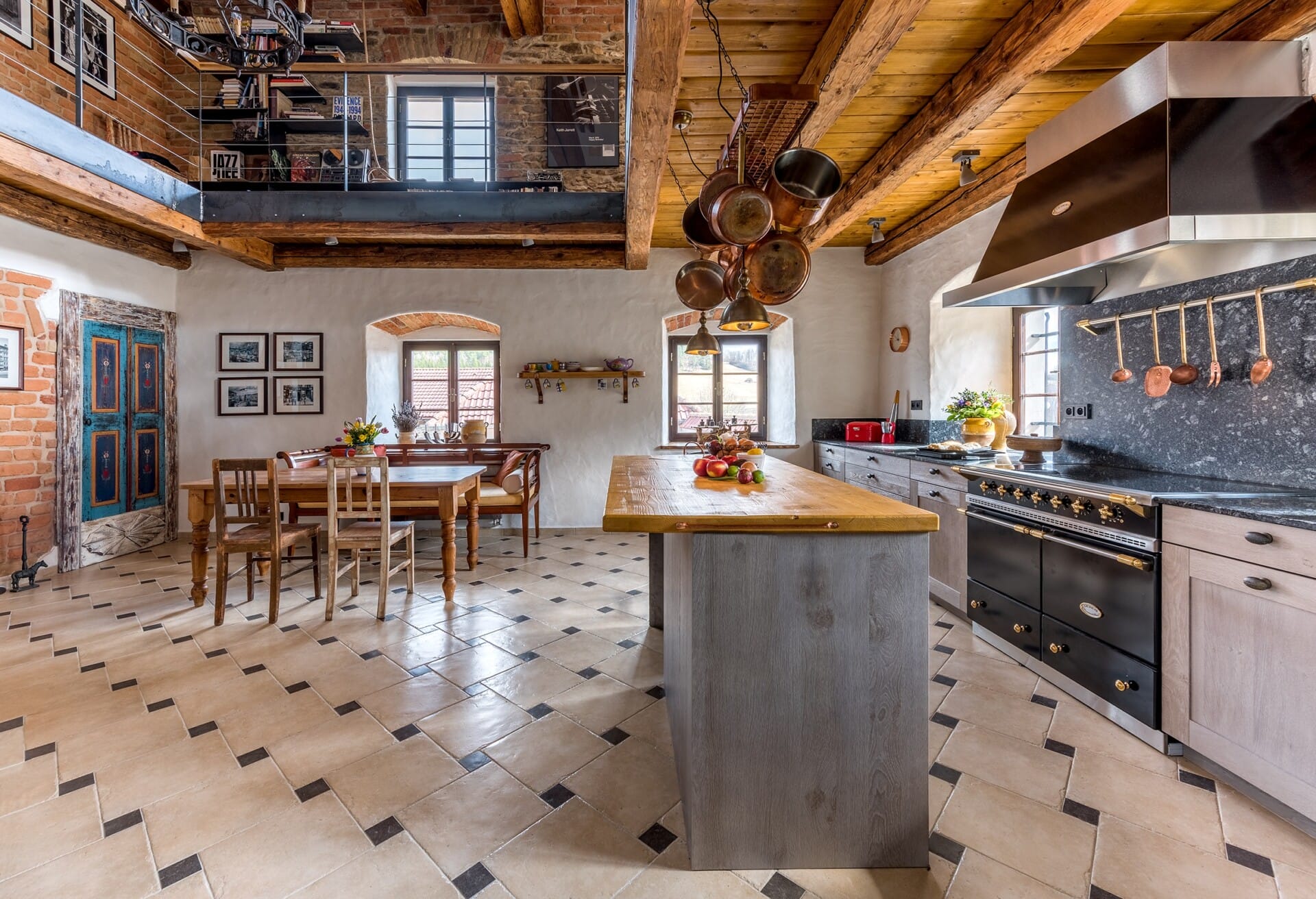 Provedení masiv rámeček dub drásaný se suky. Pracovní deska žula Azul noche. Kuchyň je vybavena spotřebiči Siemens, Lacanche a LG, doplňky Blanco.
