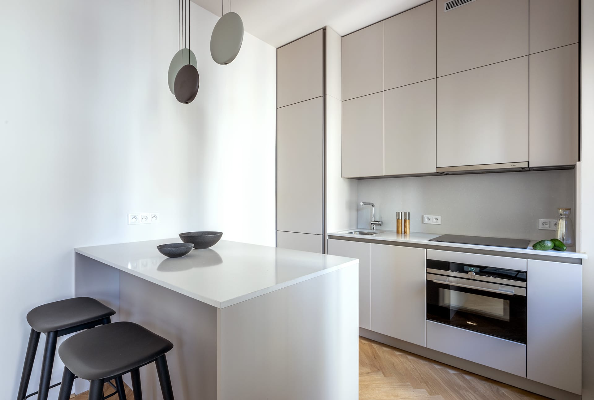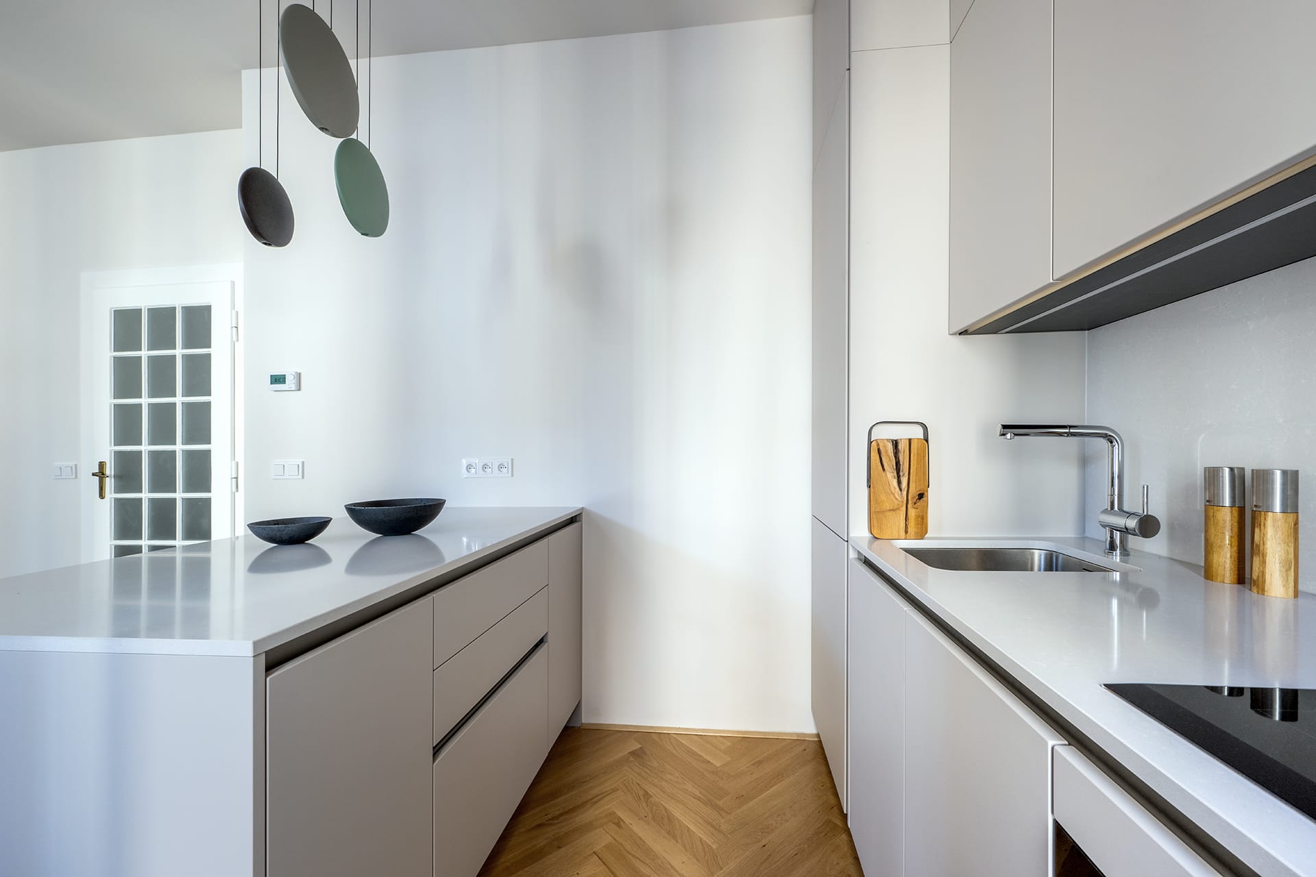 Kuchyně je vybavena spotřebiči Novy, Siemens a doplňky Blanco.