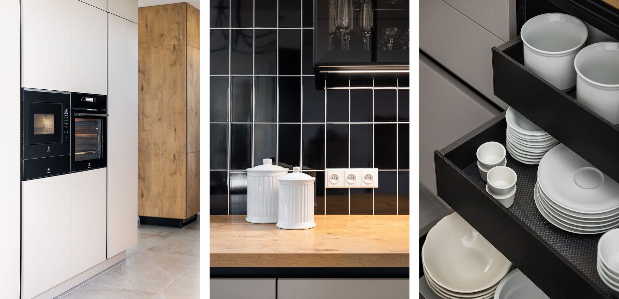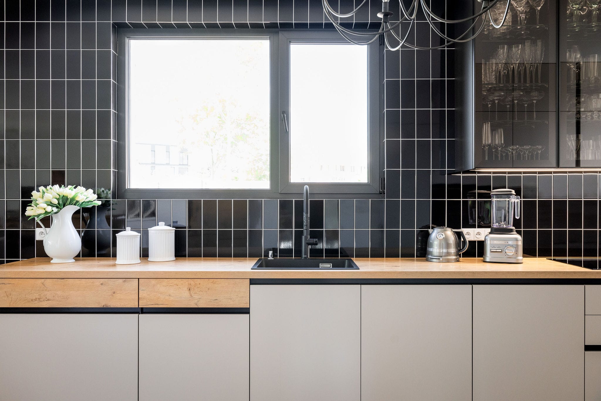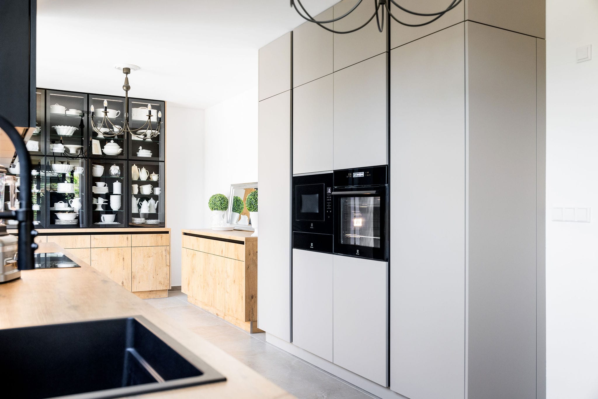 Kuchyňský nábytek Beeck Küchen, Trend K035 Halifax dub sukatý / K080 Magnolie, bezúchytkový systém. Pracovní deska Beeck Küchen K035 Halifax, dub sukatý, 39 mm. Spotřebiče Novy a Electrolux. Doplňky Blanco.