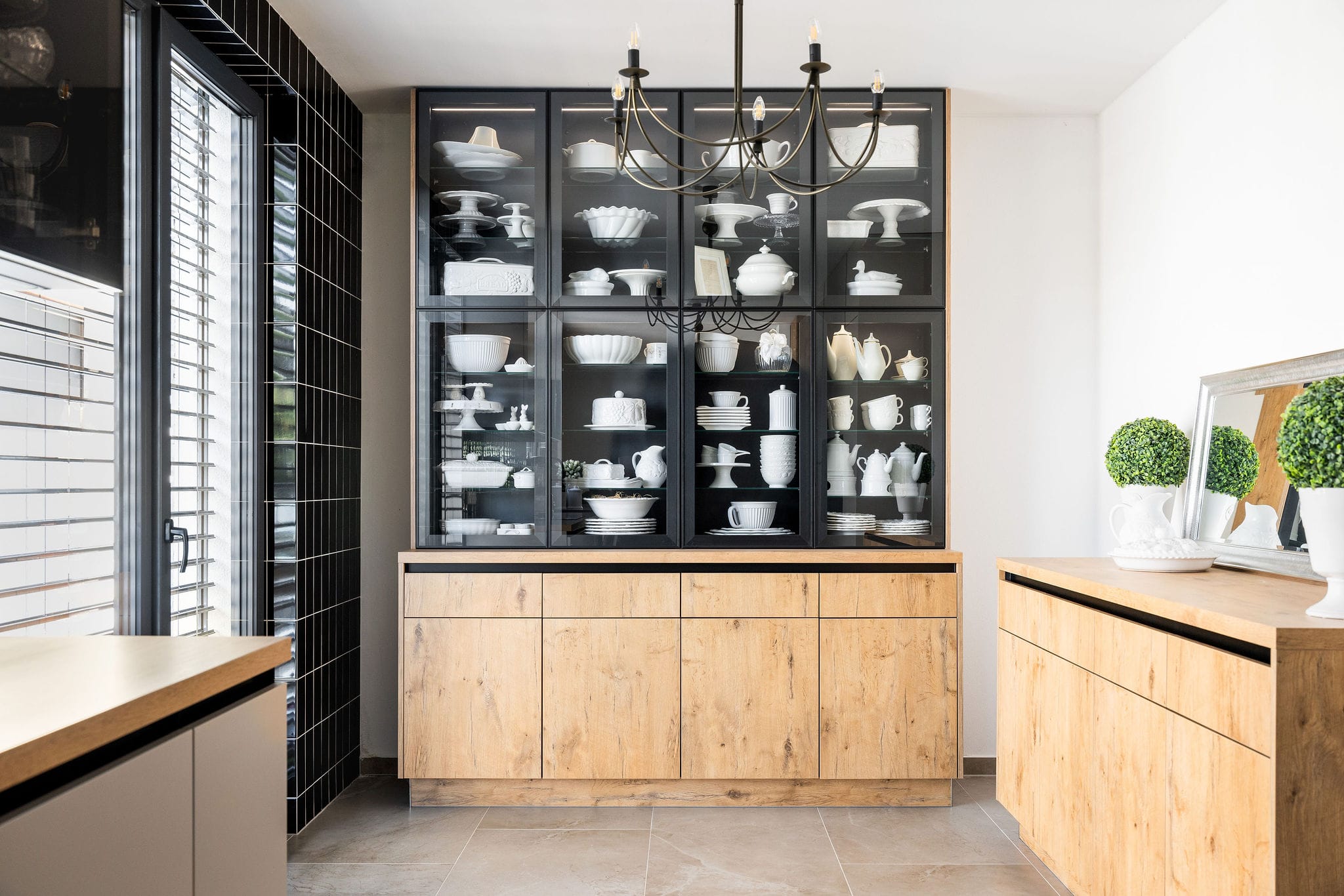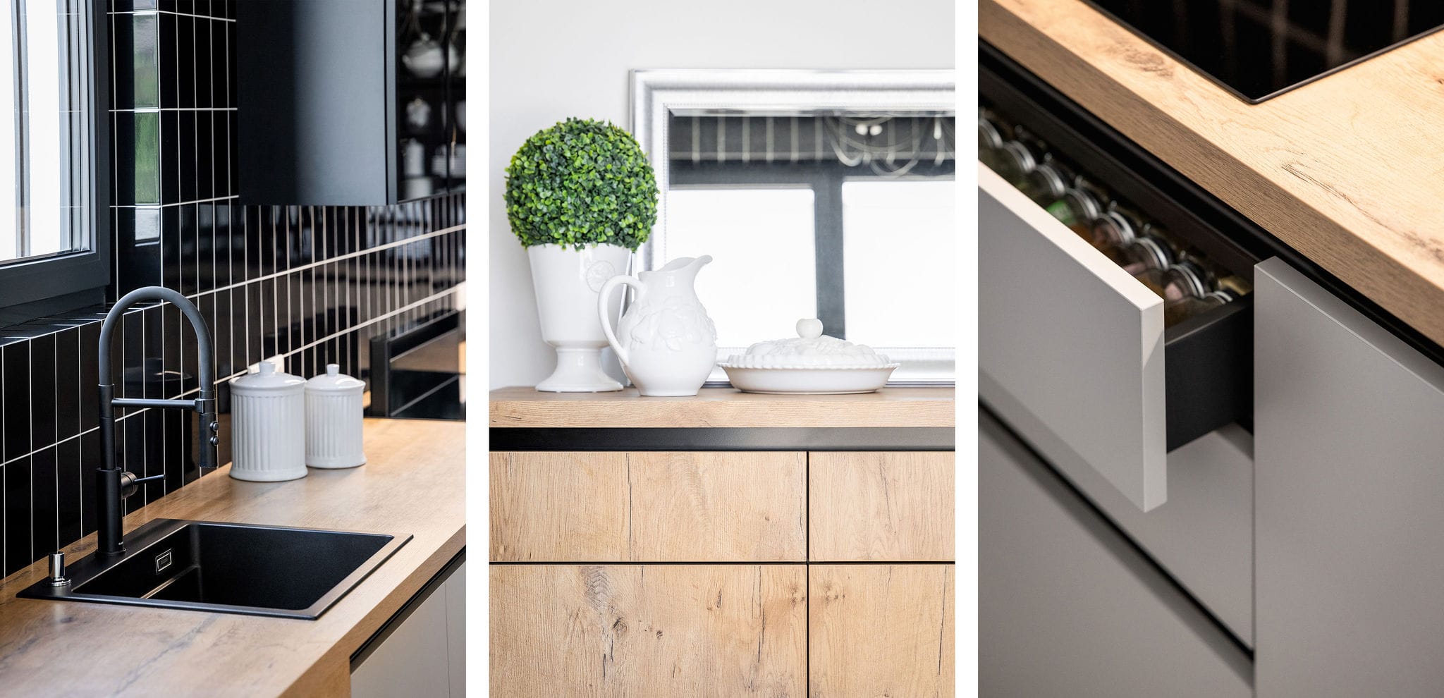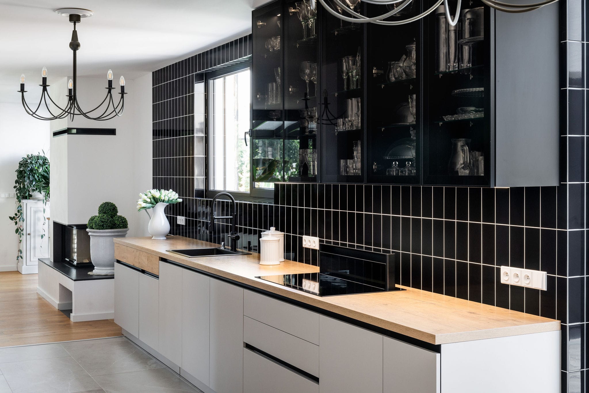Kuchyňský nábytek Beeck Küchen, Trend K035 Halifax dub sukatý / K080 Magnolie, bezúchytkový systém. Pracovní deska Beeck Küchen K035 Halifax, dub sukatý, 39 mm. Spotřebiče Novy a Electrolux. Doplňky Blanco.