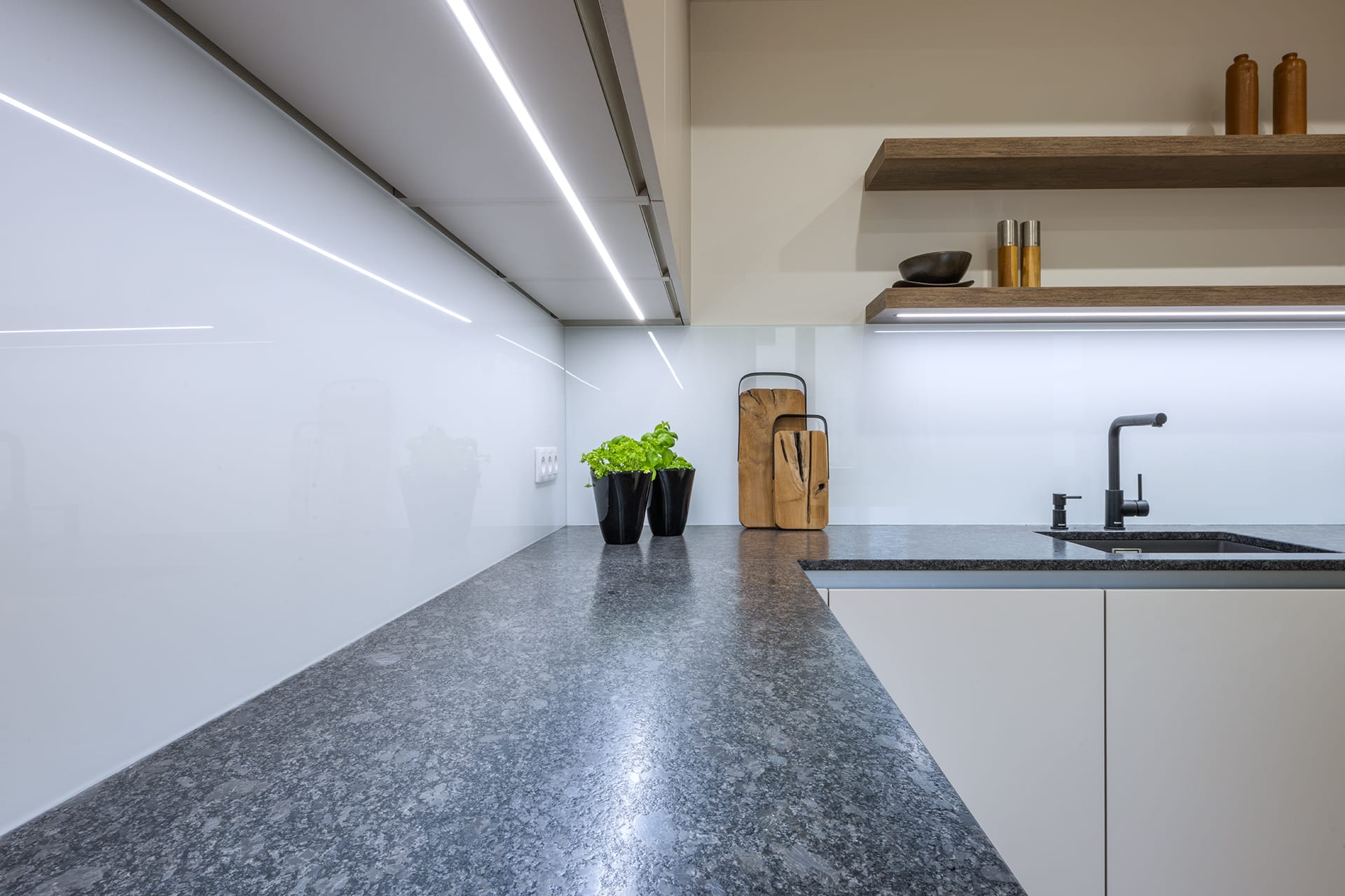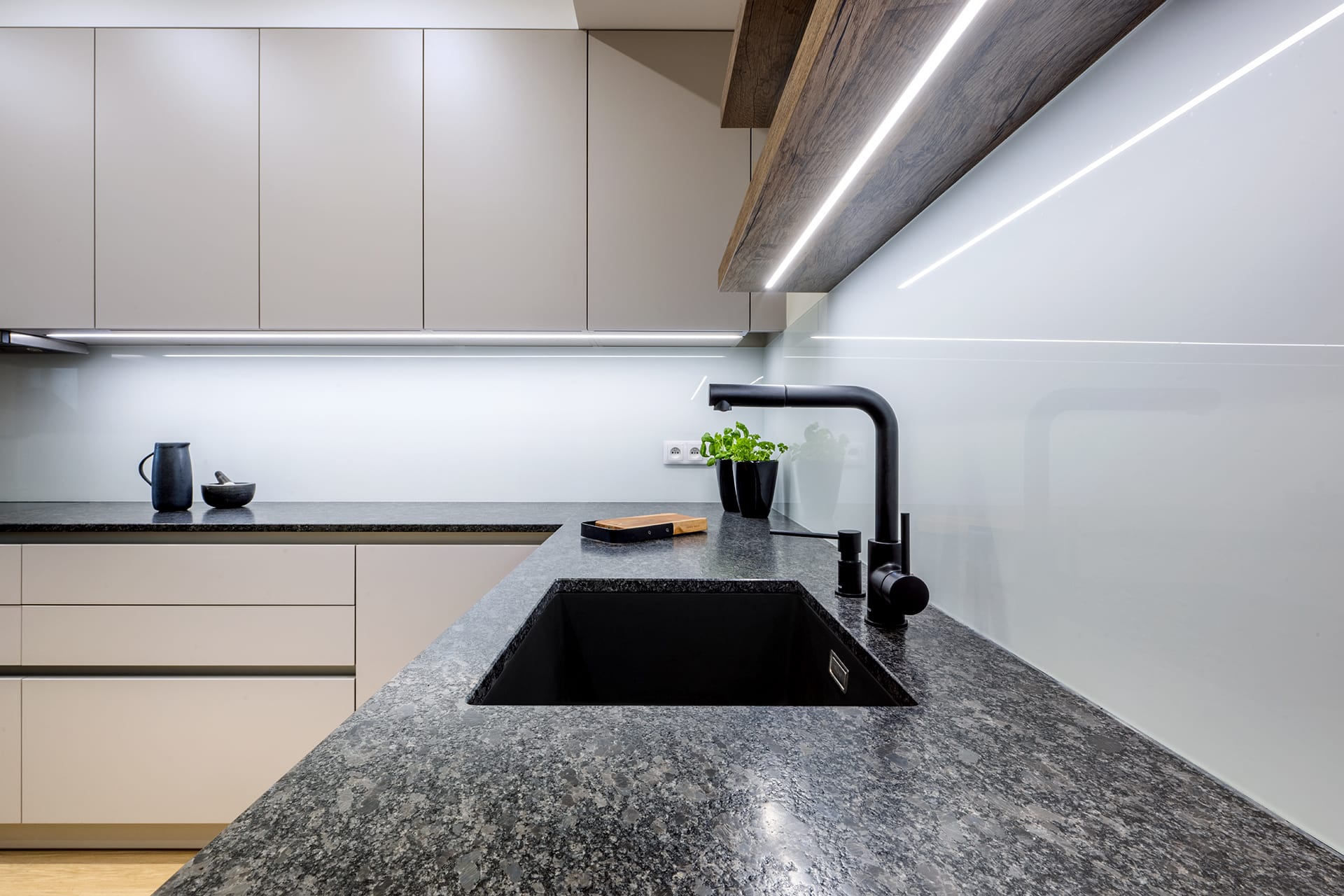 Provedení Trend UNI v barvě Kaschmir. Pracovní deska žula Steel grey v úpravě satén. Bezúchytkový systém GME, obklad sklo RAL 9003. Spotřebiče AEG a Liebherr. Doplňky Blanco.