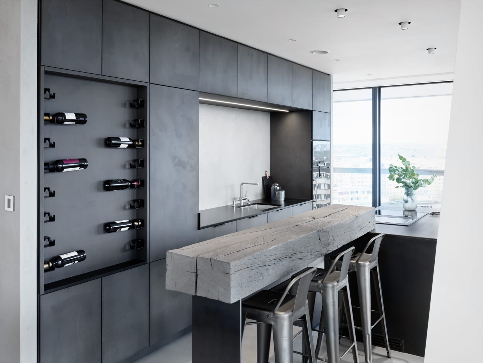 provedení Tokio betonová stěrka. pracovní deska žula Nero Assoluto. Spotřebiče Gaggenau.