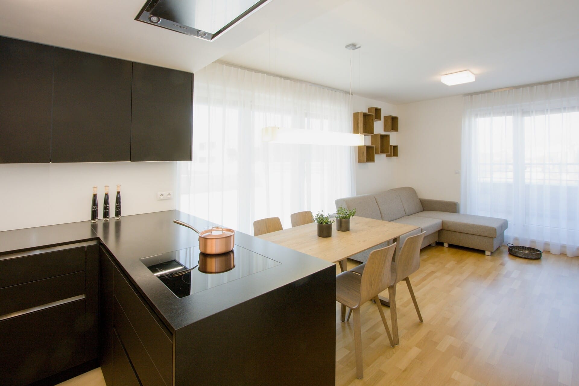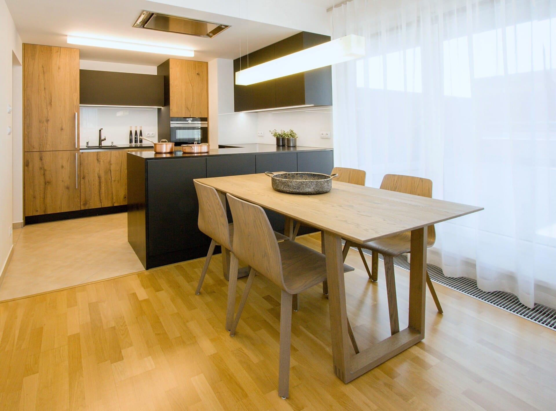 Provedení rozpraskaná dubová dýha se suky Chablis, supermat černá, bezúchytkový systém e:sign. Pracovní deska žula Nero Assoluto síla 20 mm. Kuchyň je vybavena spotřebiči Siemens a doplňky Blanco.