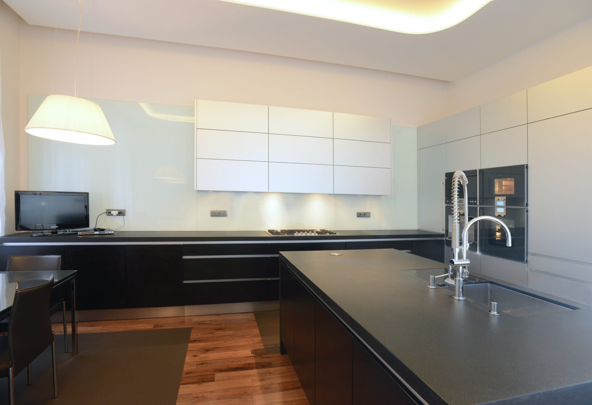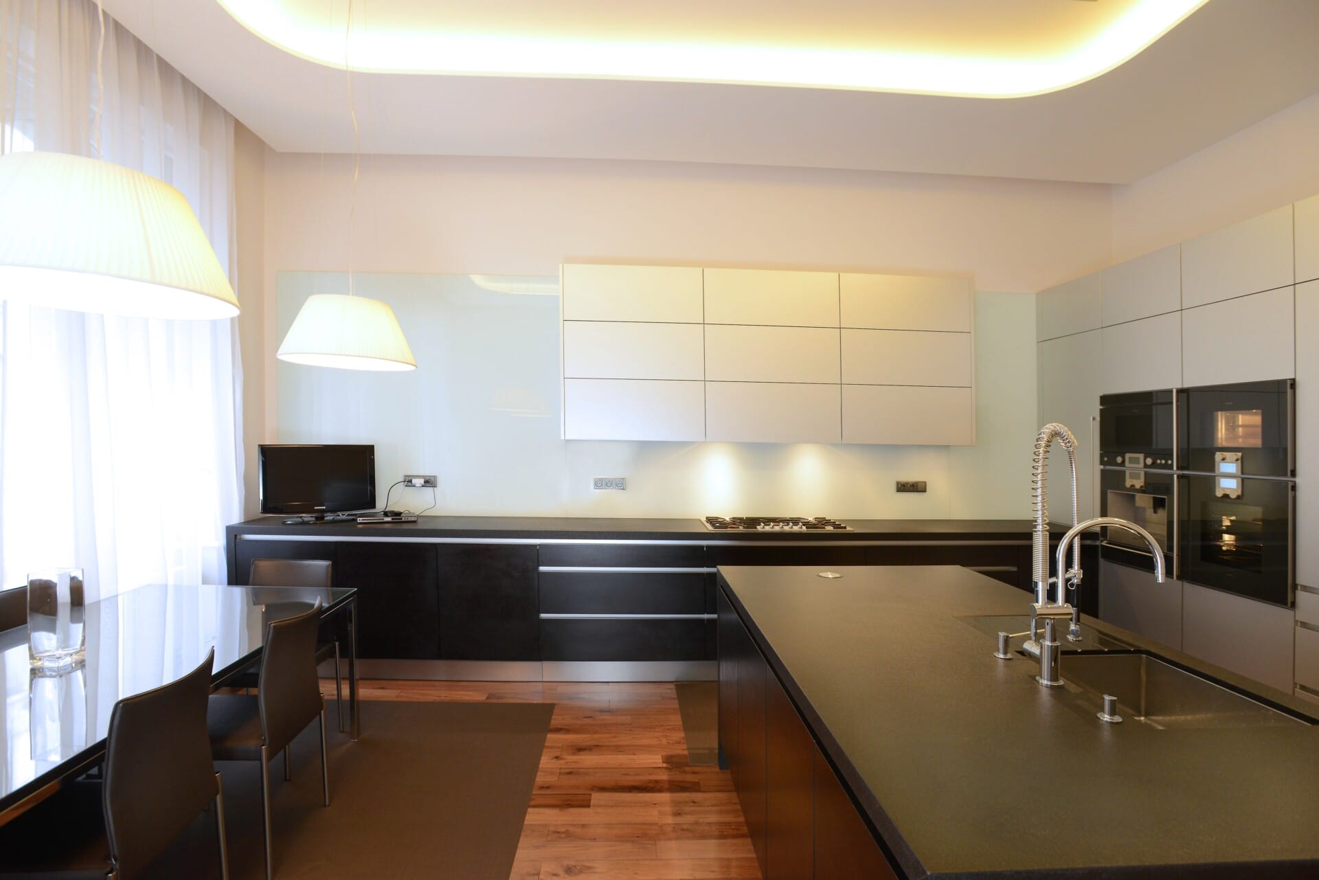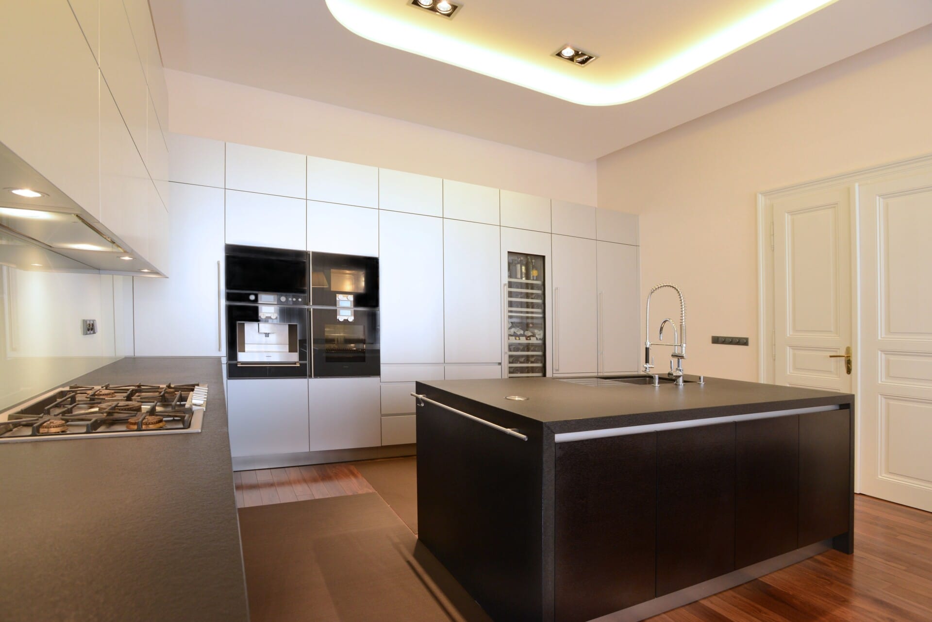 Provedení dubová dýha oak smoked v kombibaci s eloxovaným hliníkem Torino anodised finish. Pracovní deska žula Nero Assoluto patina. Spotřebiče Gaggenau a Siemens.