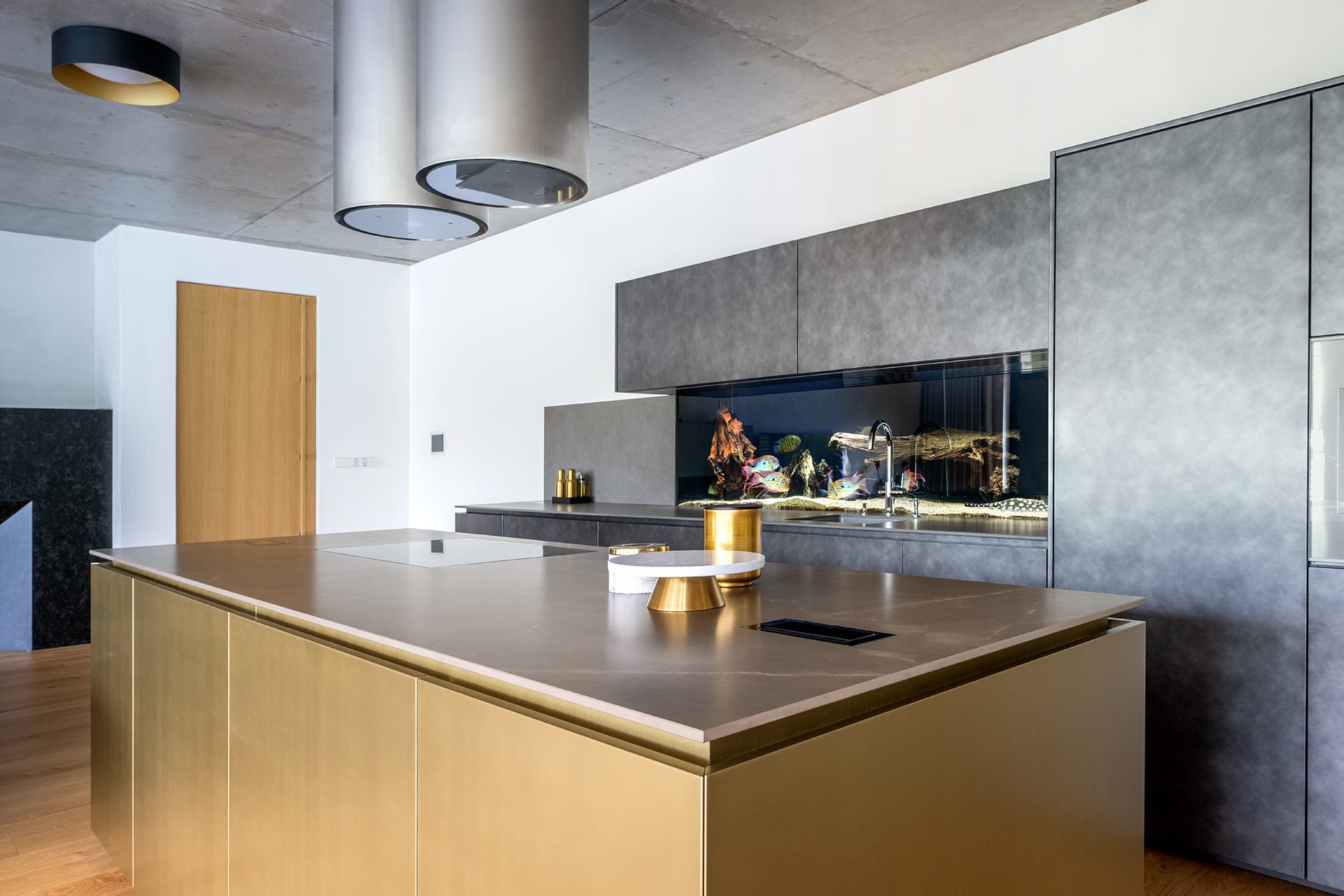 Provedení skříní metalický lak Steel grey, provedení ostrůvku metalický lak Brass. Bezúchytkový systém Ventura lakované provedení. Pracovní deska Pietra di Pulpis a obklad Neolith Pietra di Piomba. Spotřebiče Gaggenau, doplňky Blanco, Grohe, Evoline.