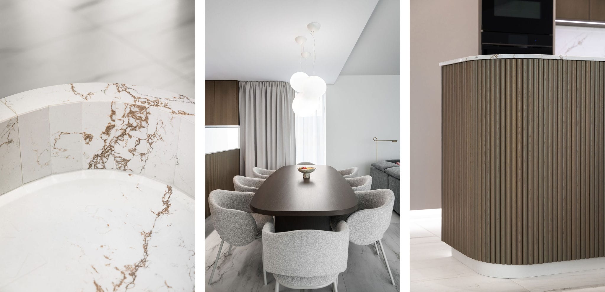 Lamelové obložení poloostrůvku dodala truhlářská výroba Skala System – dubový masiv lakovaný do barevného provedení Platinová šedá.