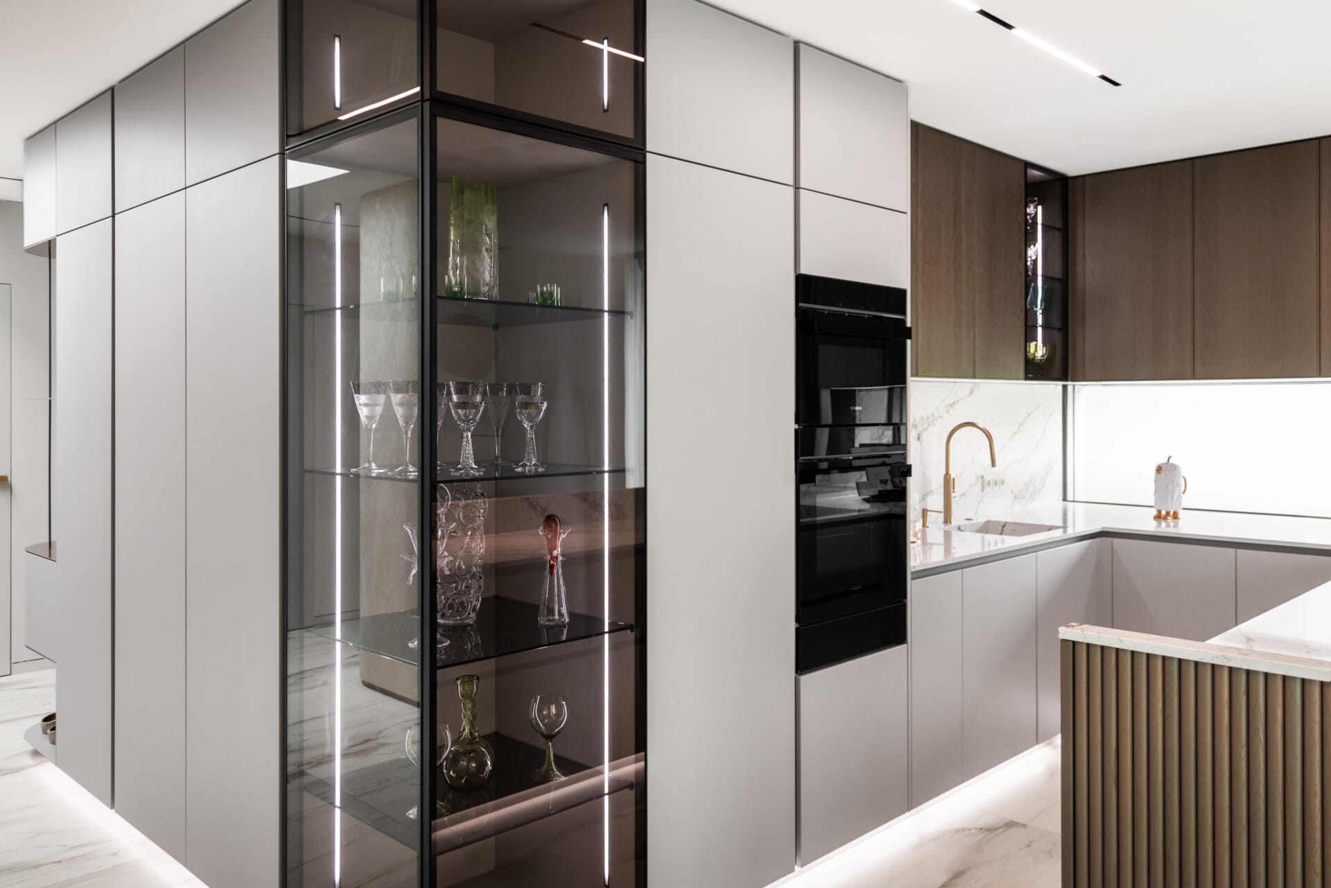 Kuchyňský nábytek Eggersmann E:Sign (bezúchytkového provedení + prosklené vitríny GLANCE). Dvířka a viditelné povrchy kombinace: matný lak - řada MODENA - 8407 Kaschmir a dýhované povrchy a rámečková dvířka – řada DAVOS – 3506 Platinum Oak.