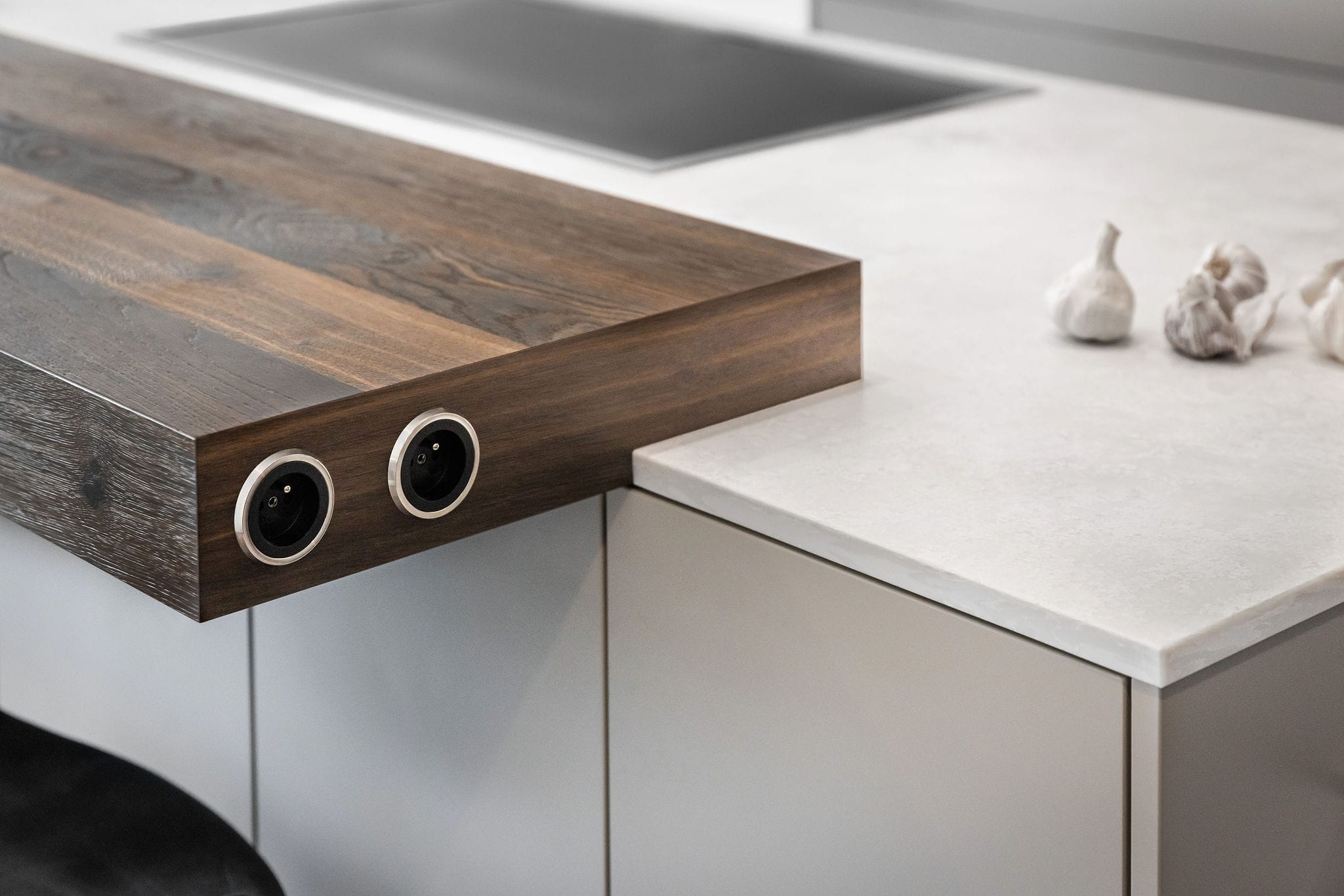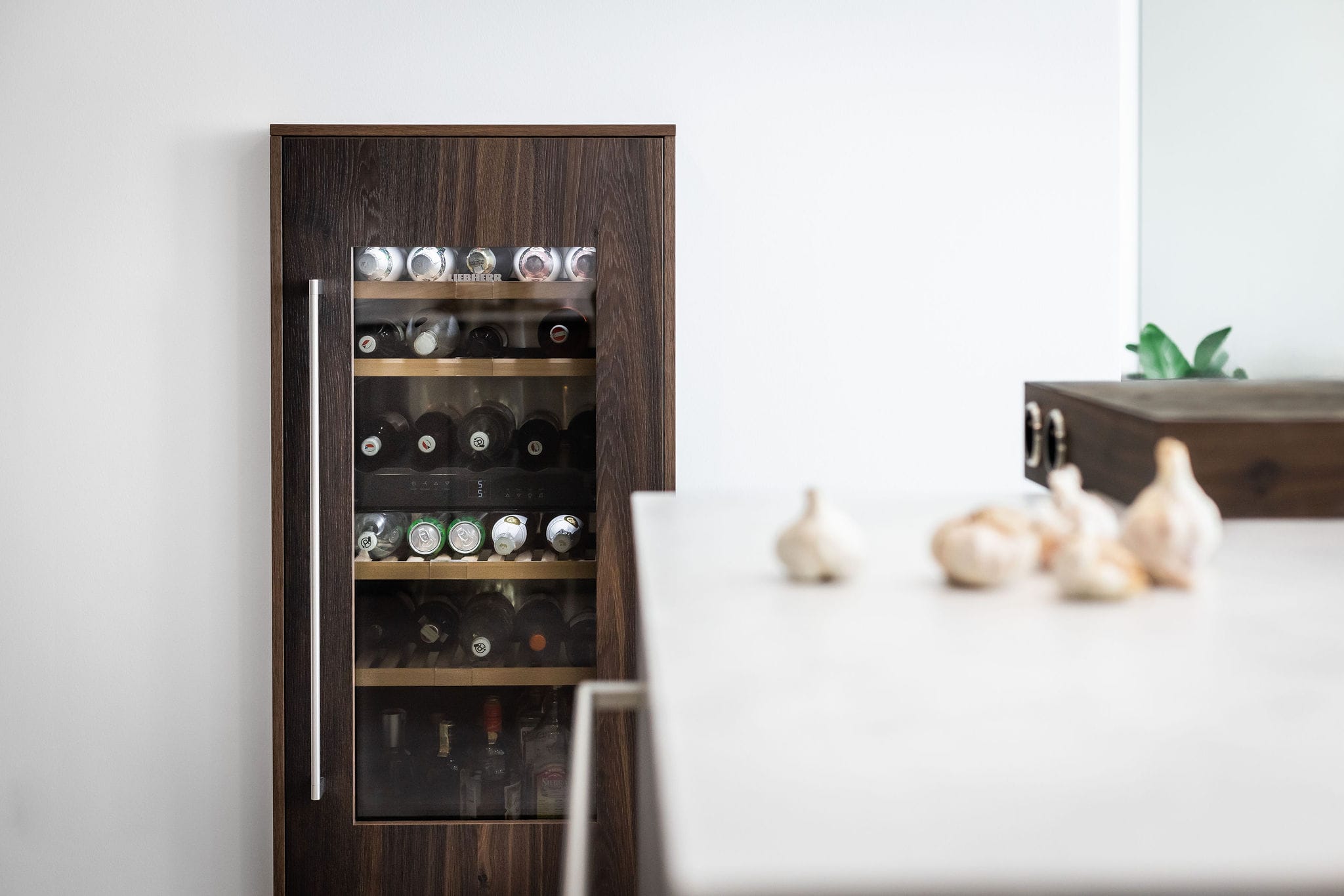 Provedení strukturovaný lak v barvě Cappuccino a mořená dubová dýha. Horní skříně melamin Bronze anthrazit. Pracovní deska Technistone Ambiente Light v provedení Terra mat. Spotřebiče Gaggenau, Liebherr, Miele a Novy. Doplňky Grohe.