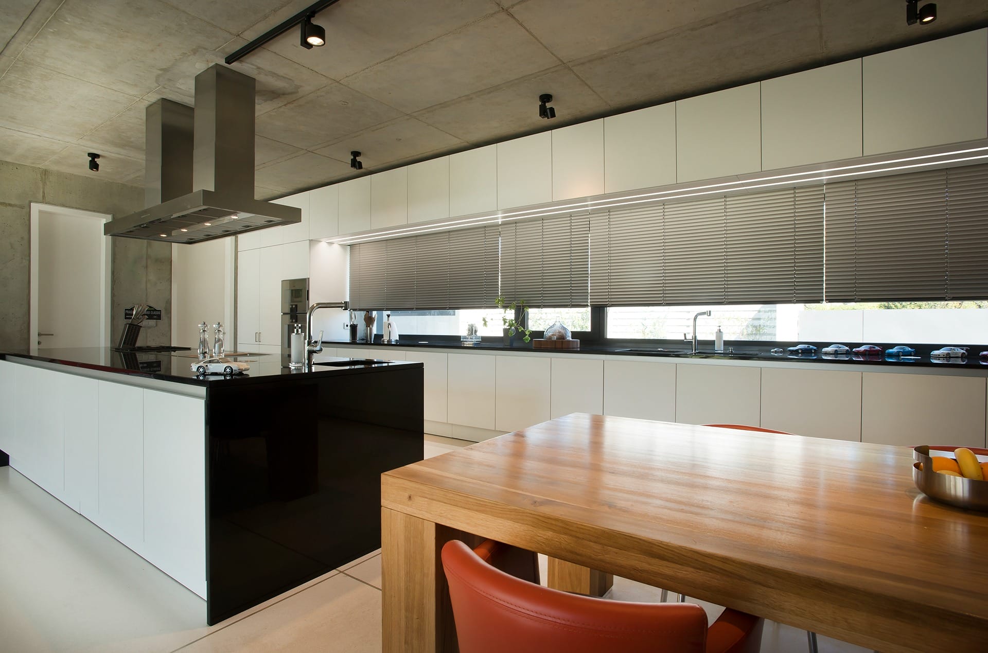 Provedení matný strukturovaný lak Ancona white. Pracovní deska a boky z umělého kamene. Spotřebiče Gaggenau.