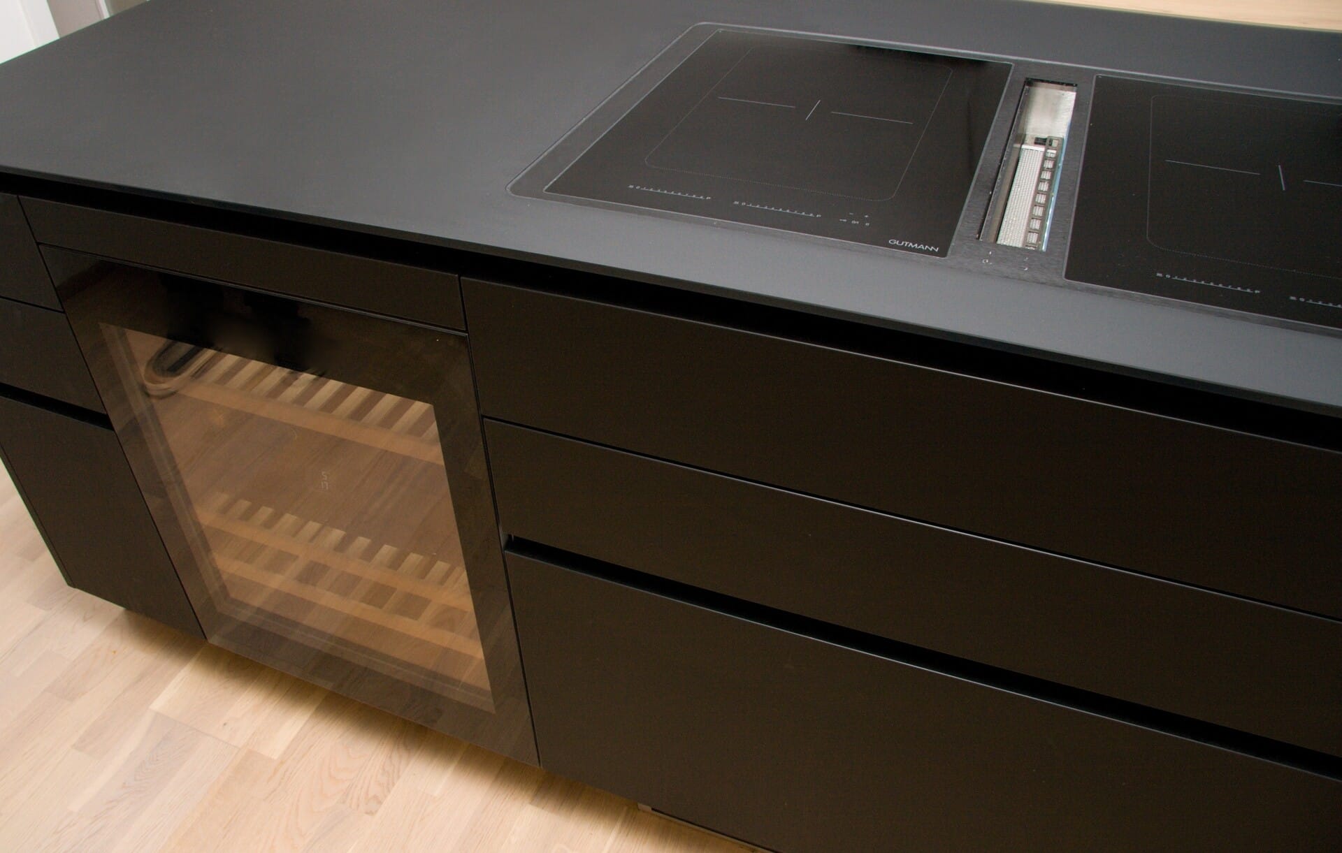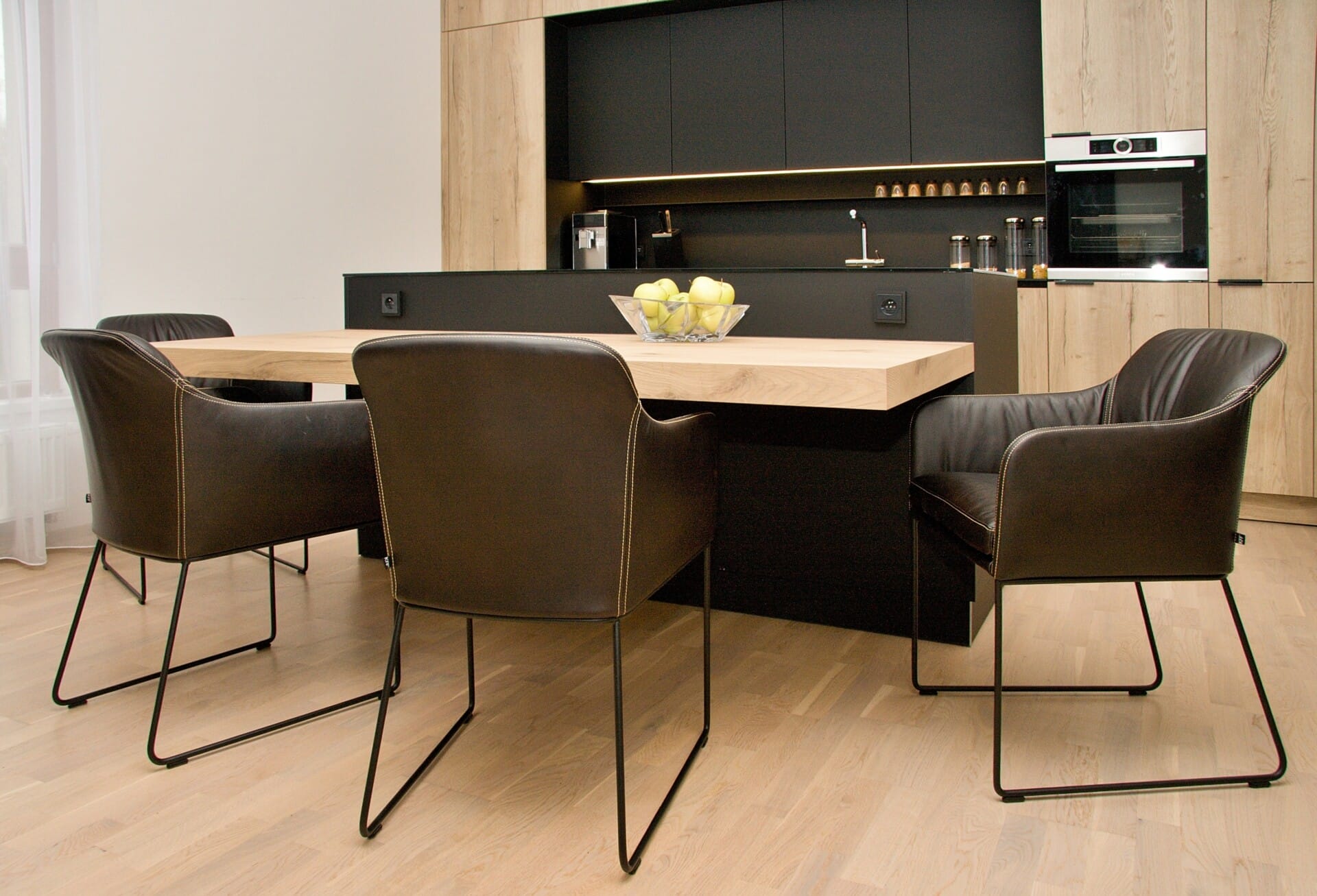 Bezúchytkové provedení E:sign, kombinace melamin Halifax oak a Nano Paso black. Pracovní deska sklo LuxRaff Diamant. Kuchyň je vybavena spotřebiči Gaggenau, Siemens a Bosch.