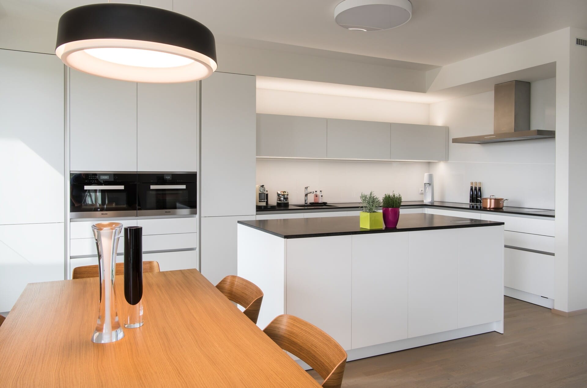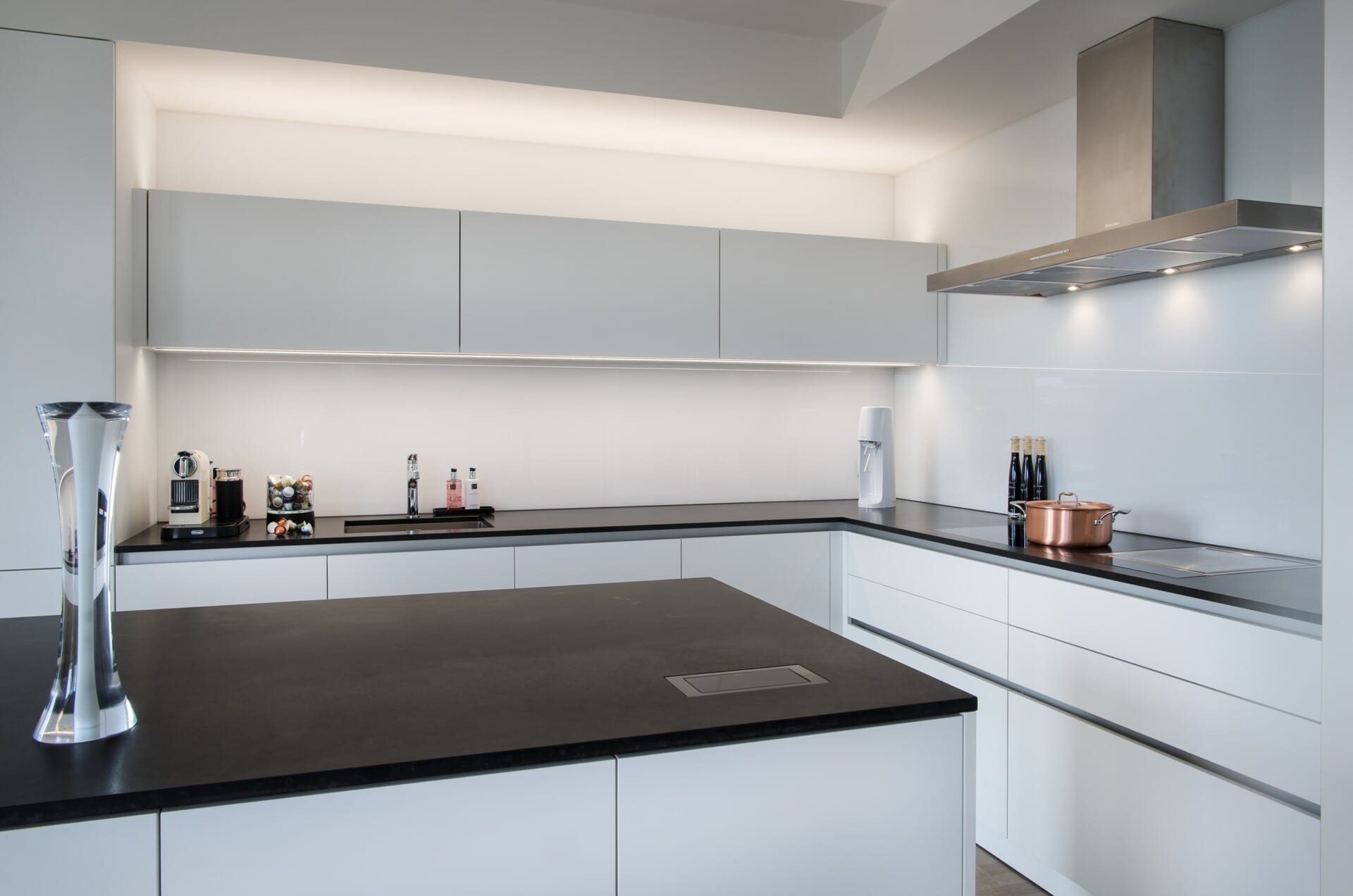 Provedení melamin Tarent bílá mat, bezúchytkový systém e:sing hliník. Pracovní deska žula Nero Assoluto Satinato. Kuchyň je vybavena spotřebiči Miele, doplňky Blanco.
