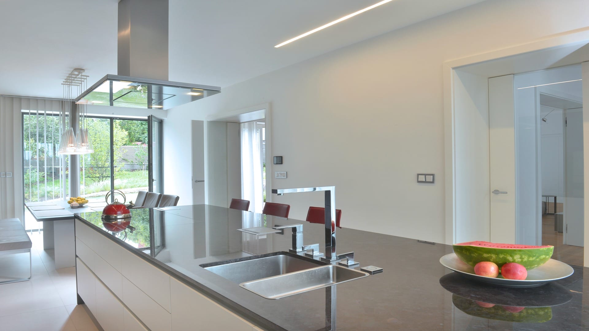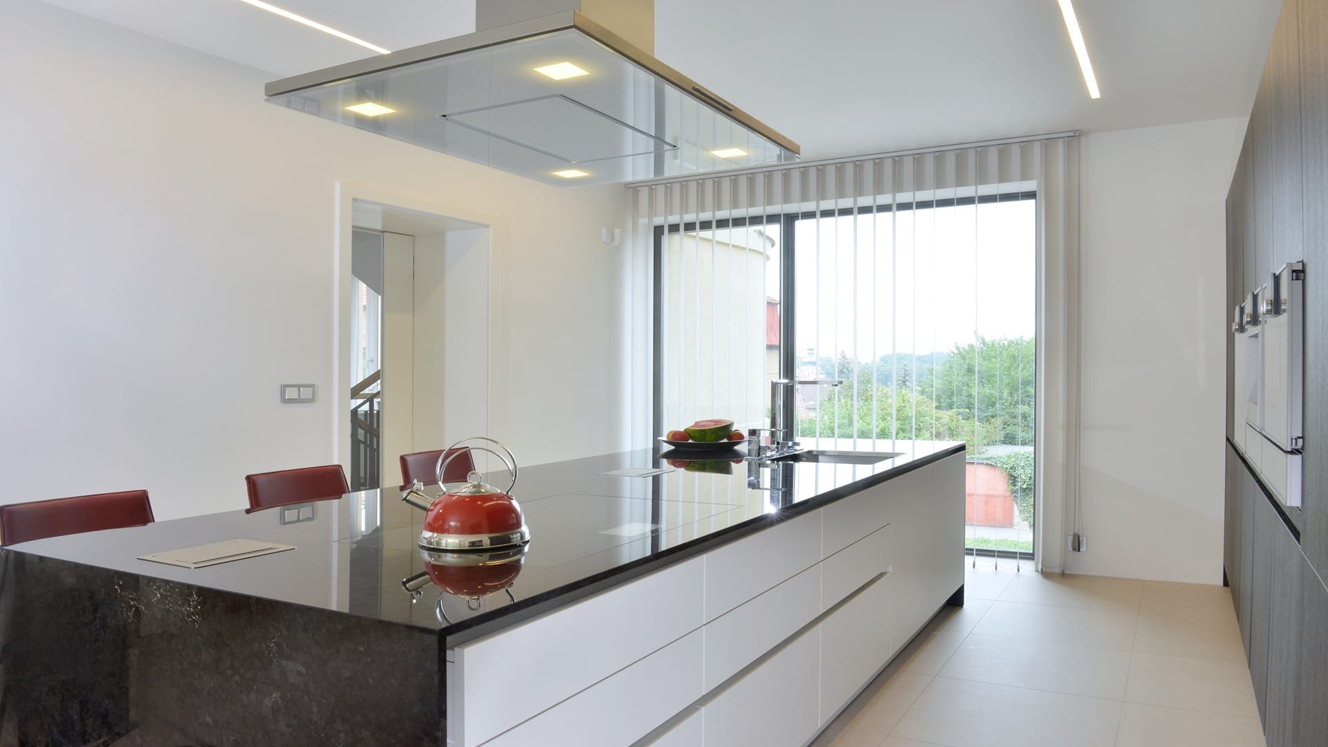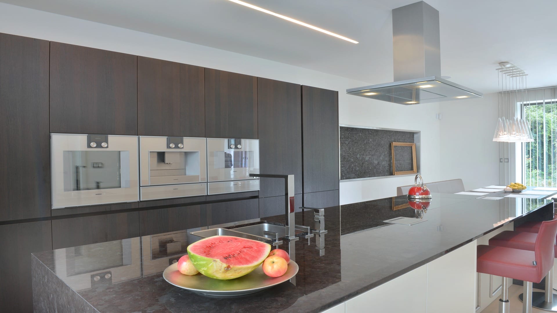 Provedení v bezúchytkovém systému e:sign, Polymat Cannes White a drásaná dýha Smoked Oak. Pracovní deska žula Antic brown lesk. Spotřebiče Gaggenau.