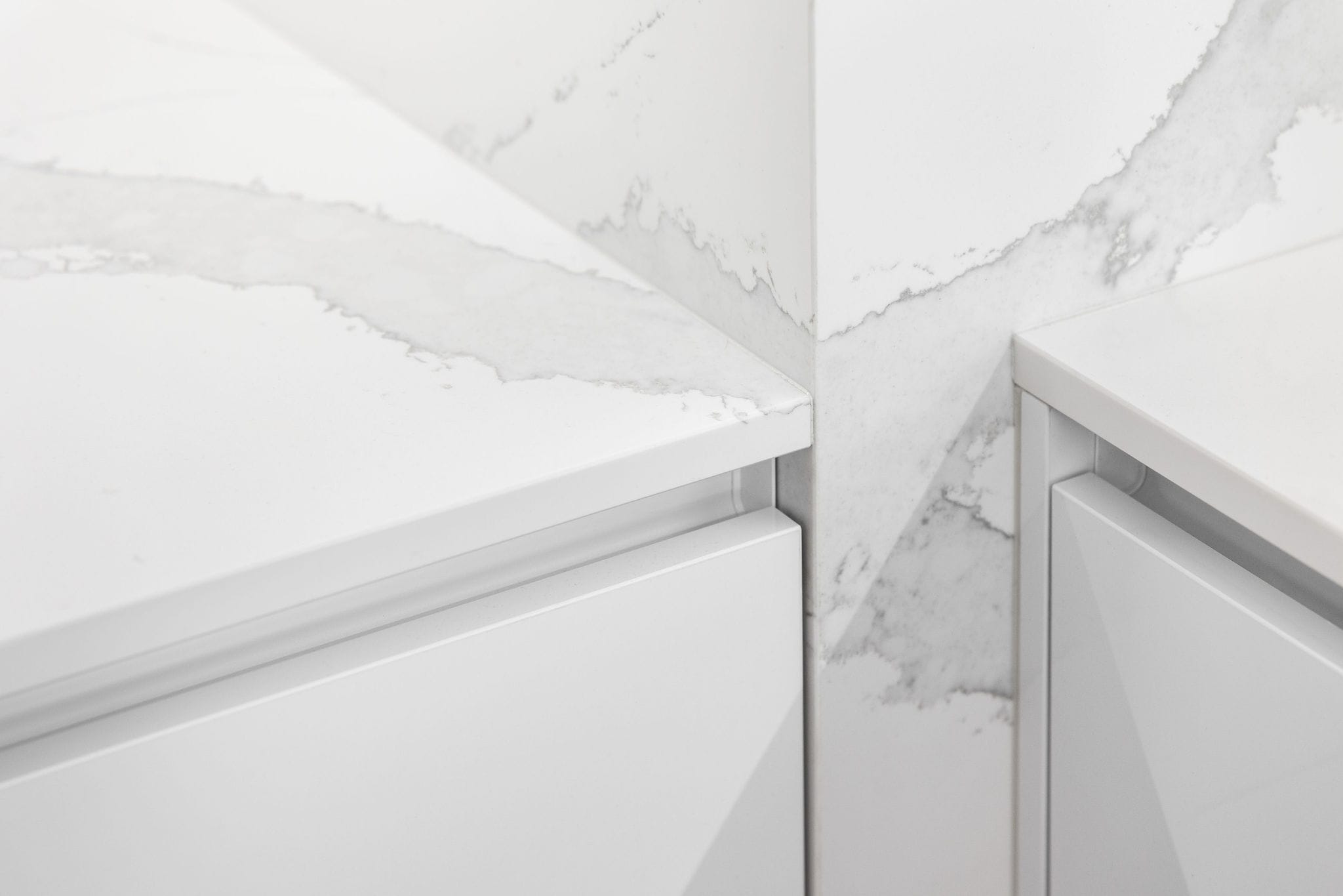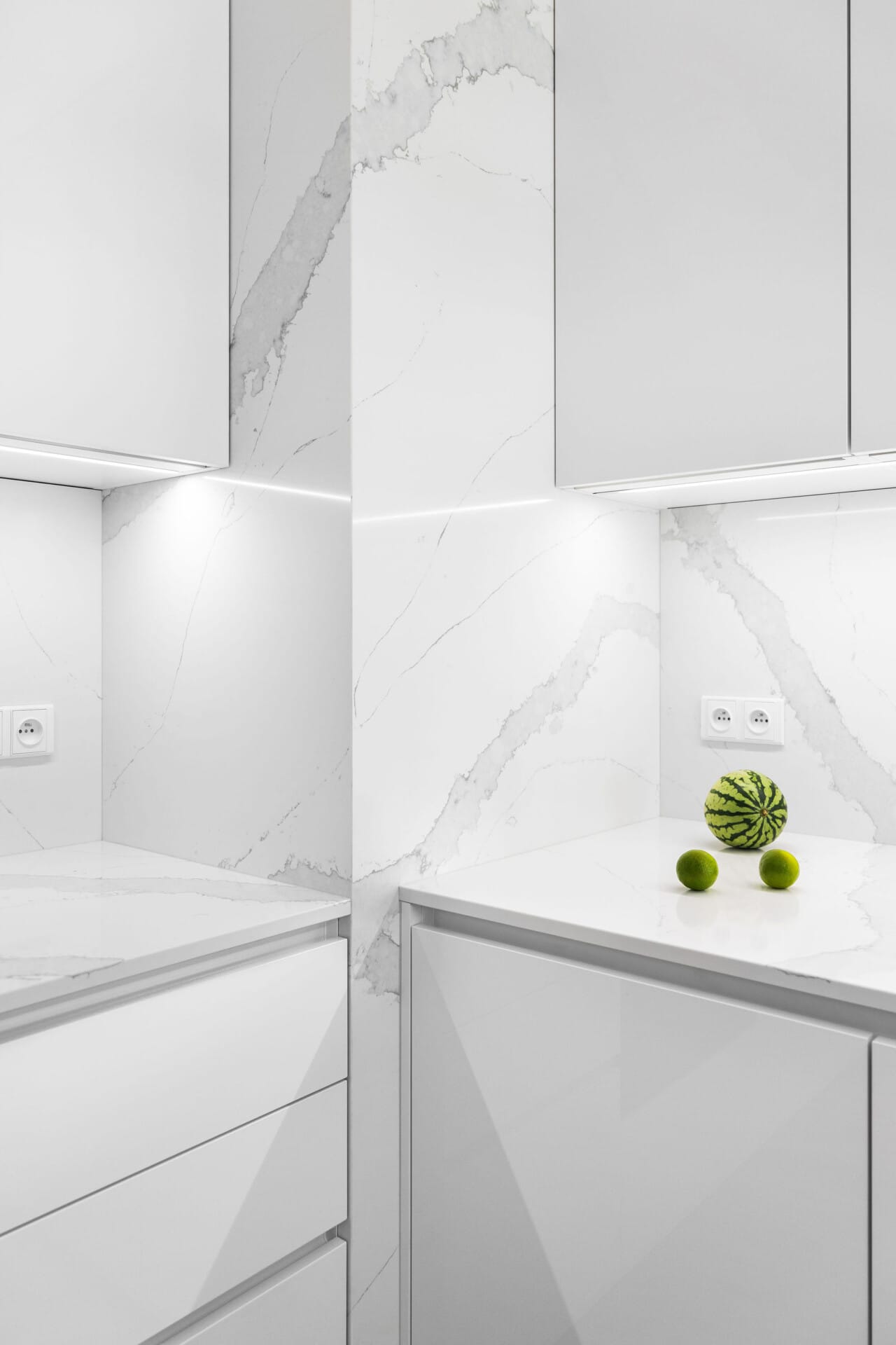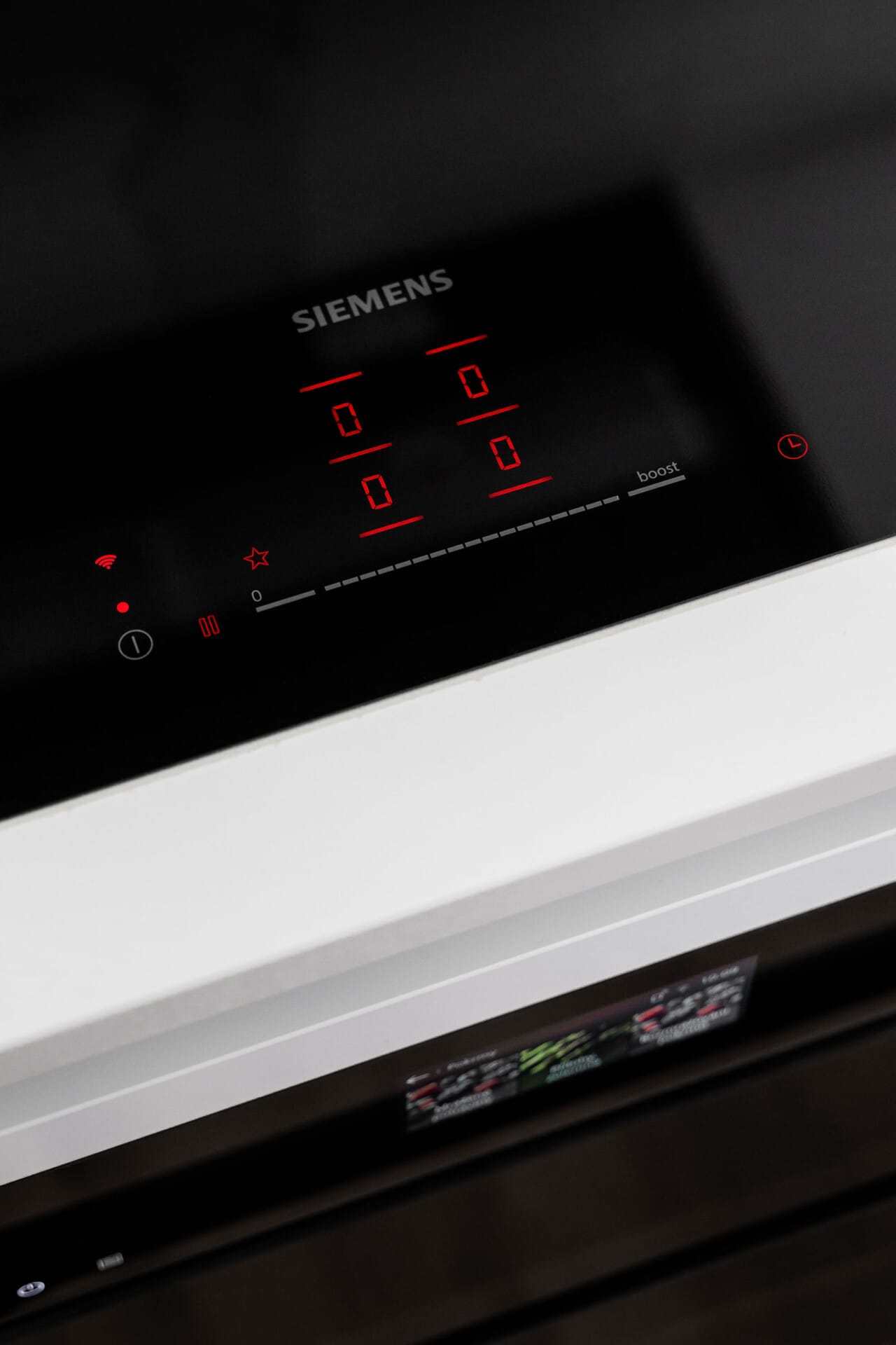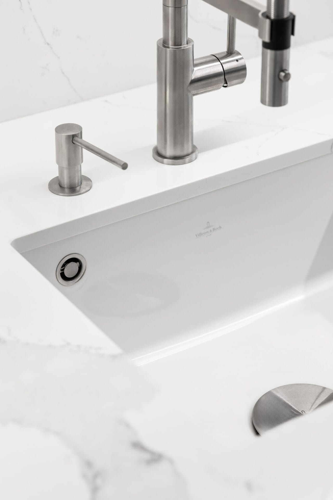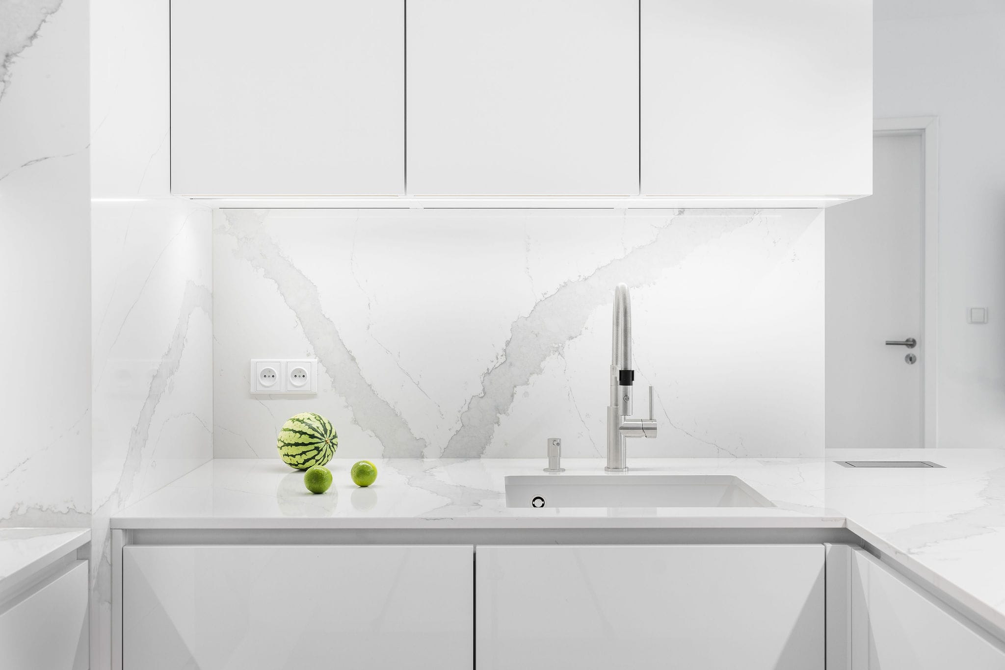 Pracovní deska Technistone Calacatta Pastino, 20 mm, lesk. Spotřebiče Siemens. Doplňky: Baterie a keramický dřez Villeroy&Boch.