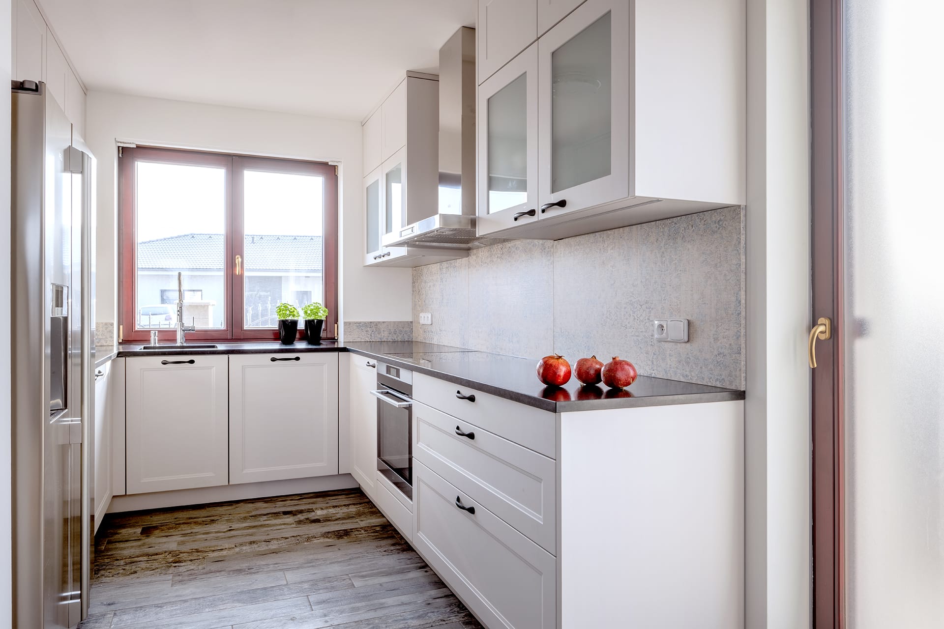 Provedení kombinace programu Ravena a Roma v barvě Satin s úchytkami. Pracovní deska Žula Nero Assoluto Black Zimbabwe o tloušťce 30mm. Spotřebiče AEG, doplňky Blanco.
