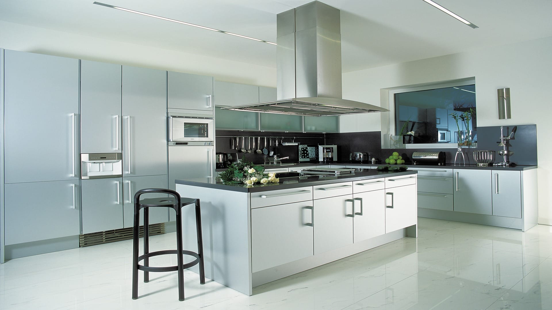 Provedení Eloxovaný hliník, pracovní deska žula Nero Assoluto. Spotřebiče Gaggenau.