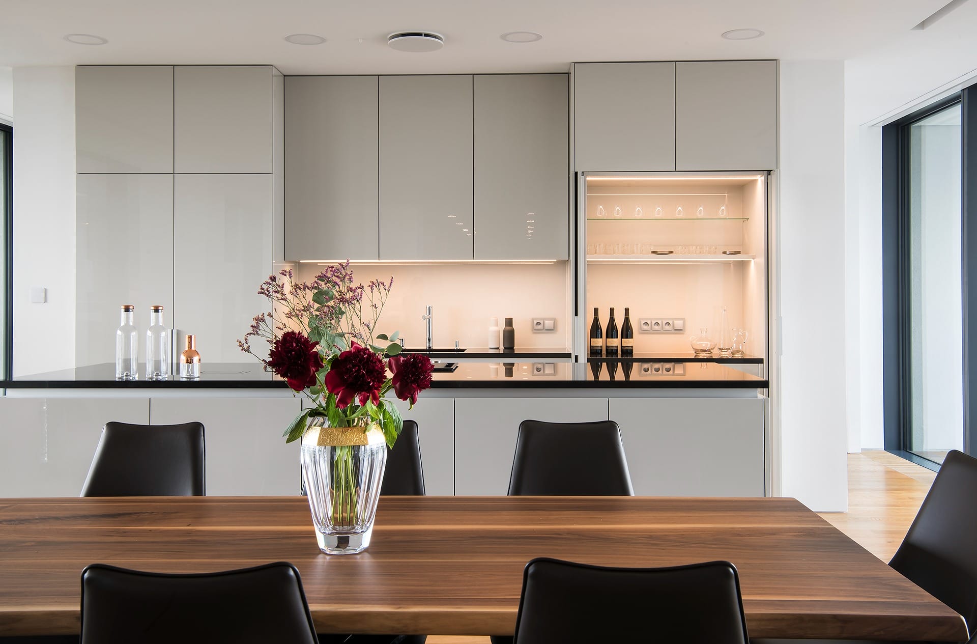 Provedení lak ve vysokém lesku Pebble grey. Pracovní deska žula Nero Assoluto. Spotřebiče Gaggenau a Siemens.