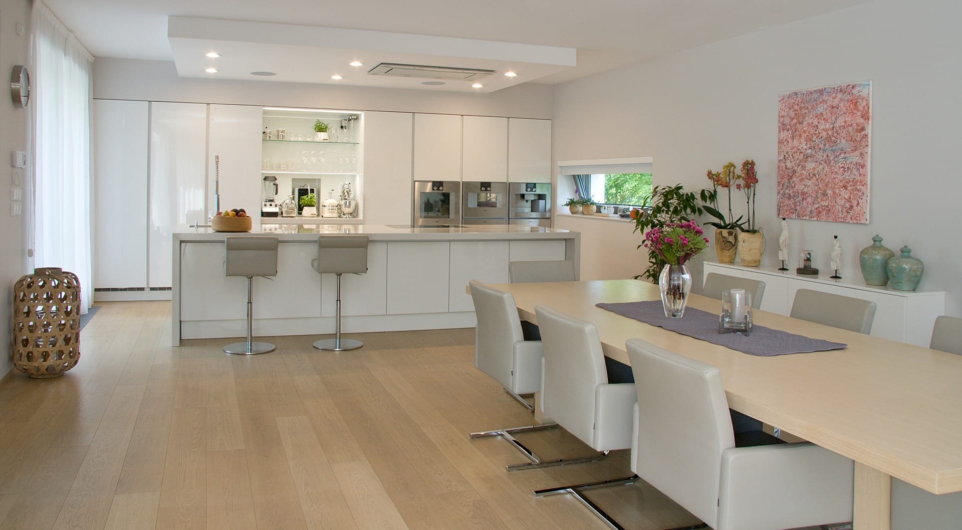 Provedení akrylový Polar white. Pracovní deska Technistone Nevada. Spotřebiče Gaggenau.