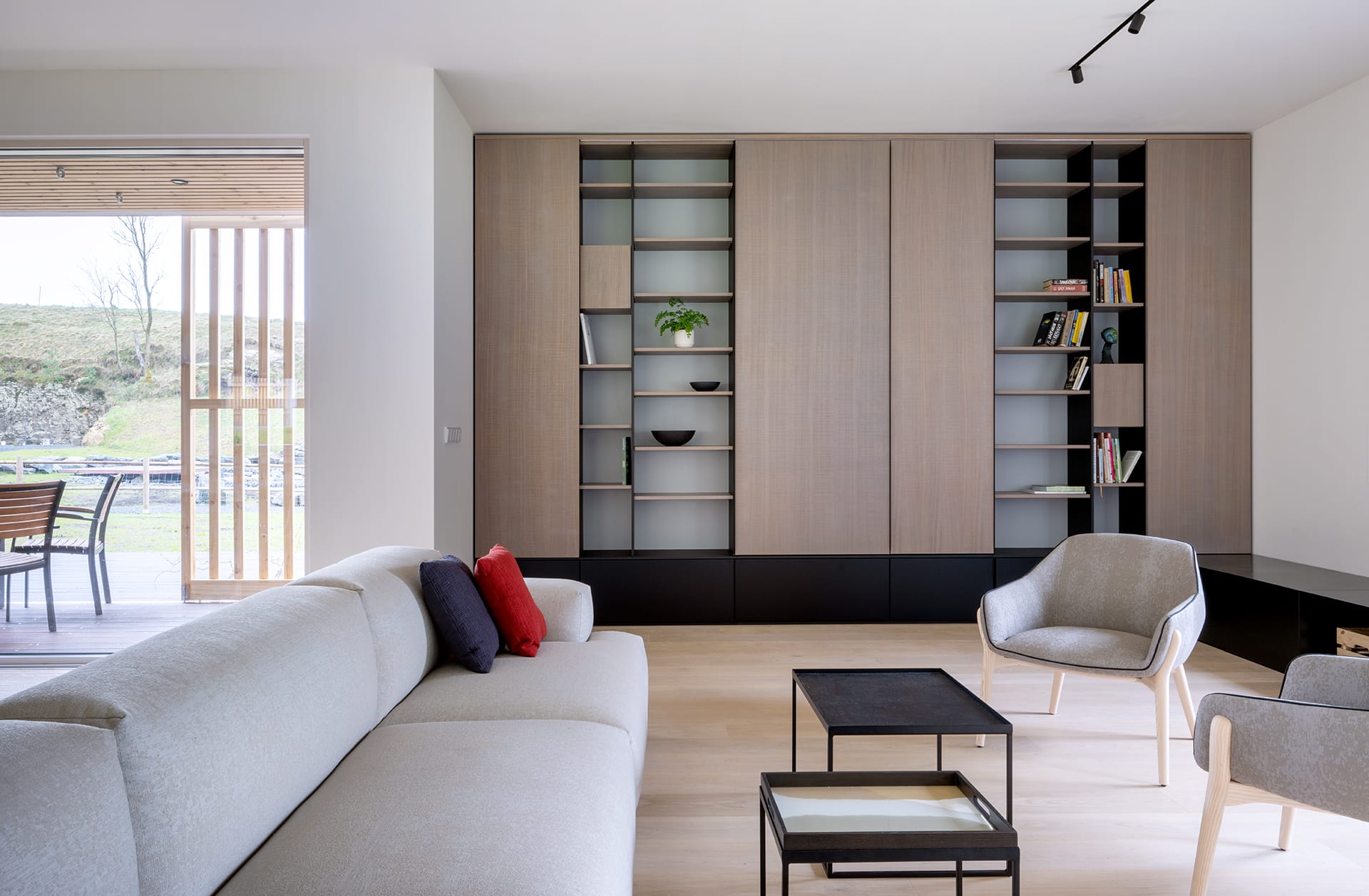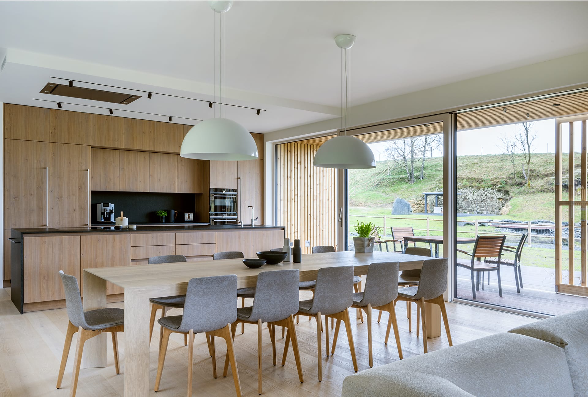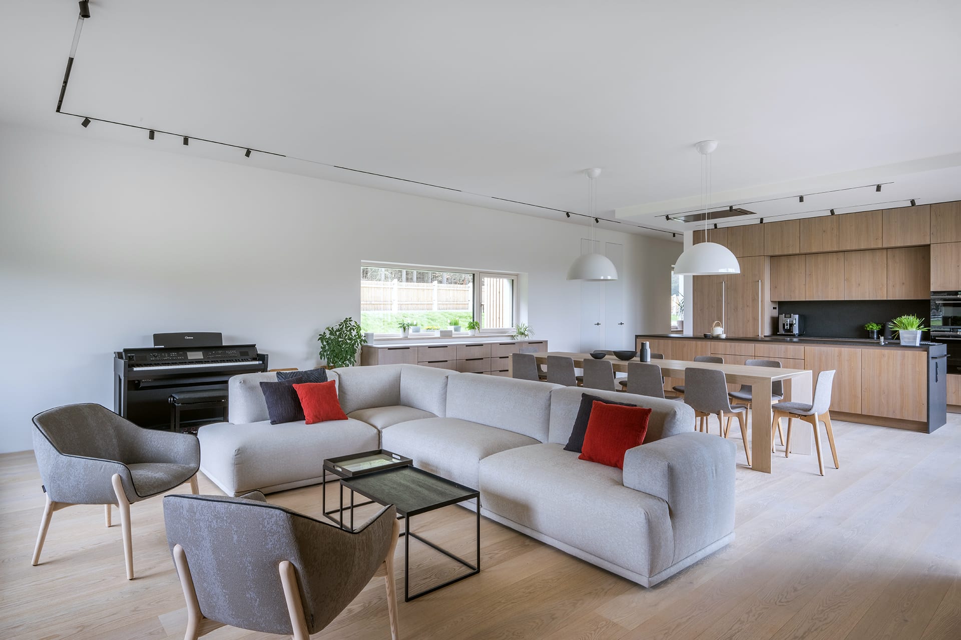 Provedení dýha dub katrovaný sukatý 1,5 mm olej, čela spodních skříní lakovaná, korpusy perlově šedé. Výsuvy Blum LegraBox. Osvětlení Häfele Loox.