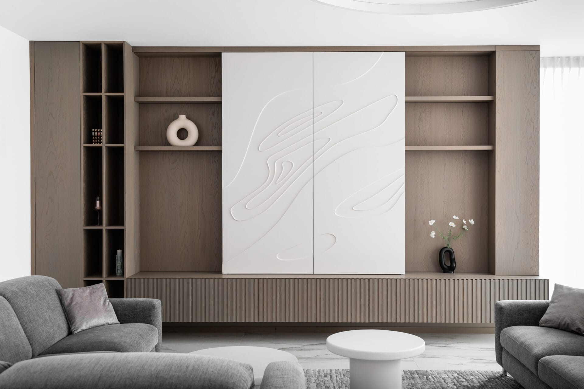 Dýha dub Sundry, kartáčovaný, olej Rubio – Platinová šedá / Matný lak RAL 9003 u posuvných dveří s reliefém.