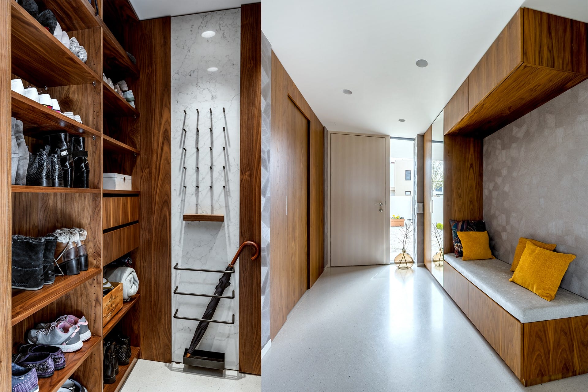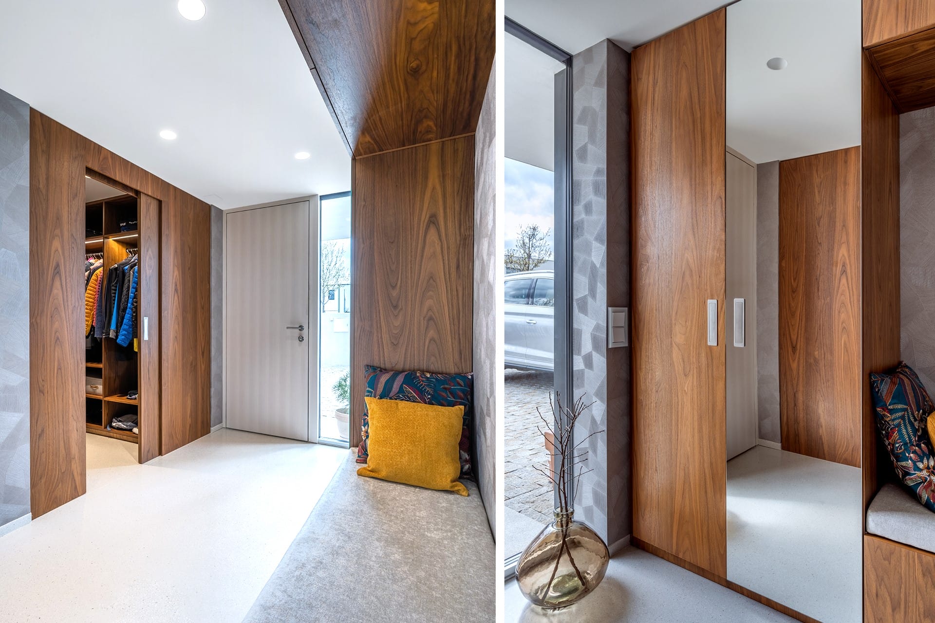 Provedení dýha ořech americký fládrovaný složený na spárovku, polomatný lak s mořidlem, čela spodních skříní umělá kůže Mixology Leather Inspired, výsuvy Blum LegraBox, osvětlení Häfele Loox