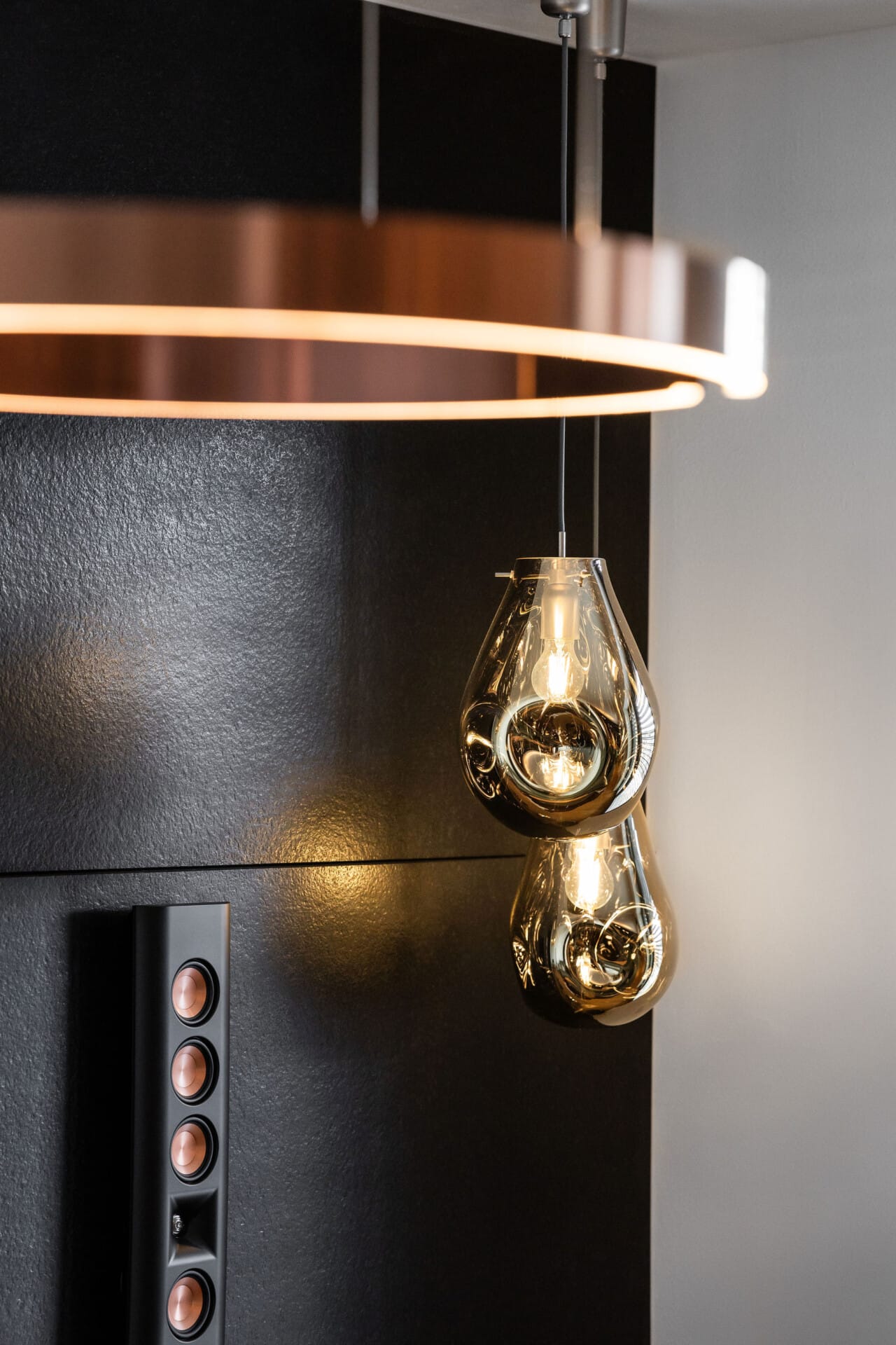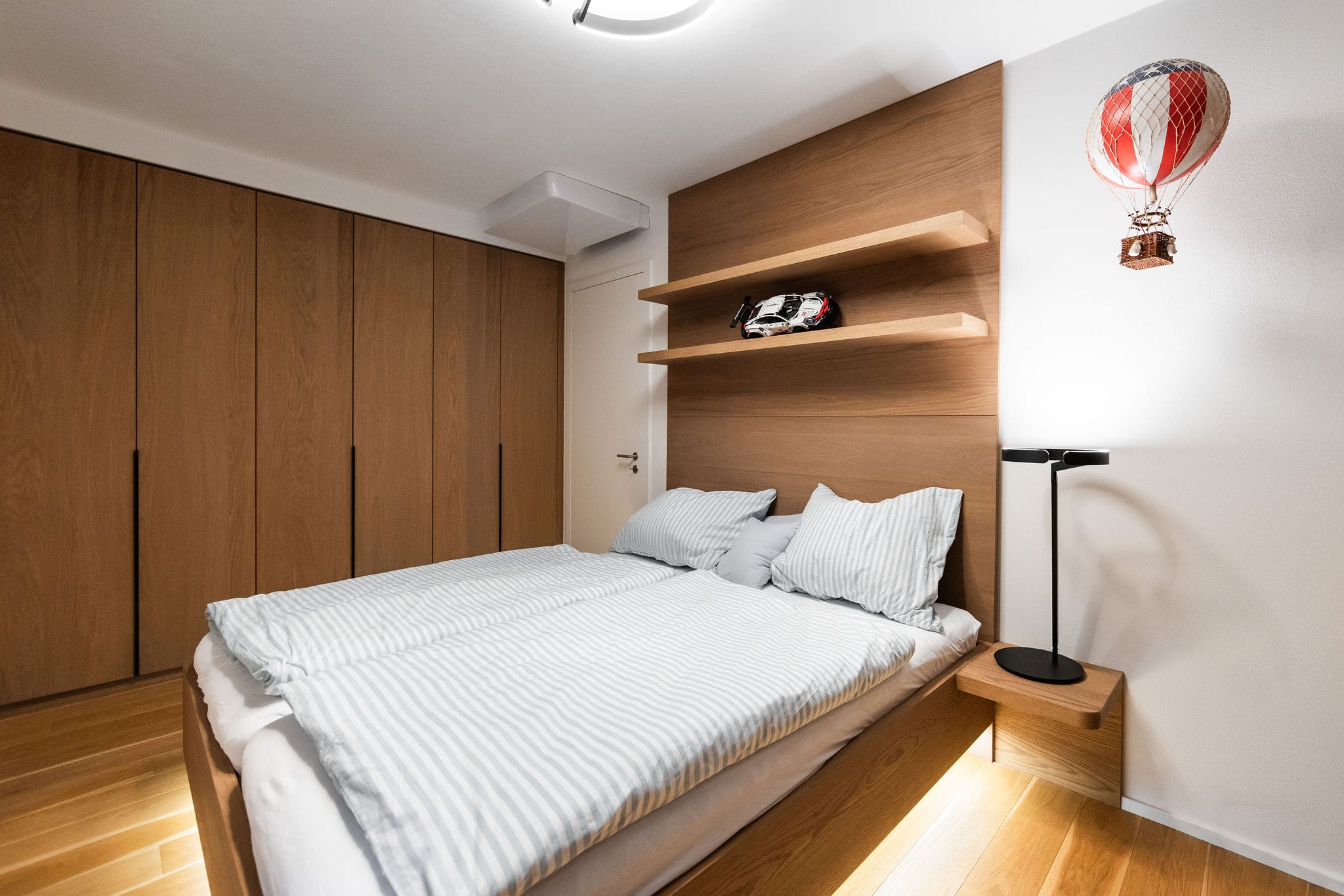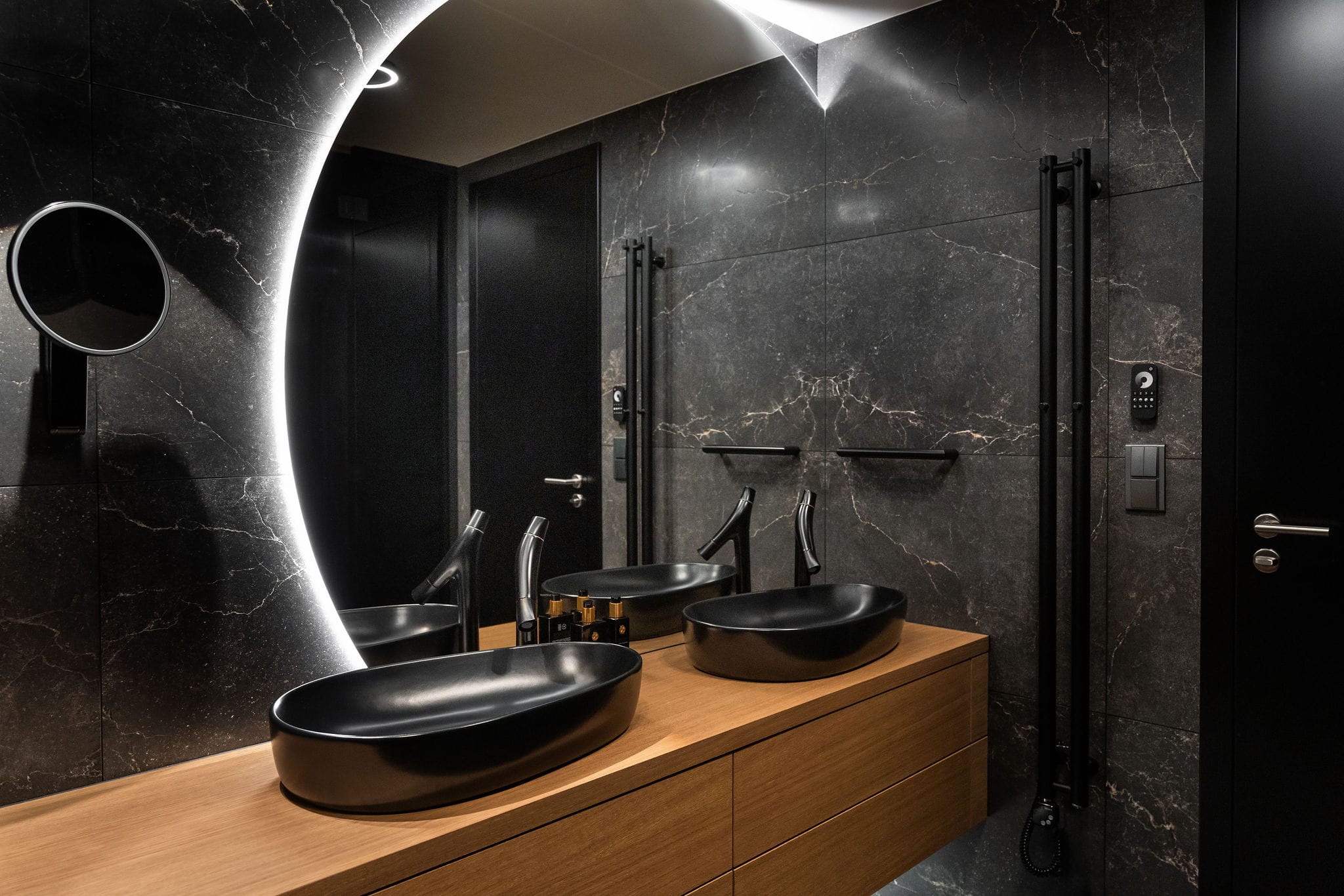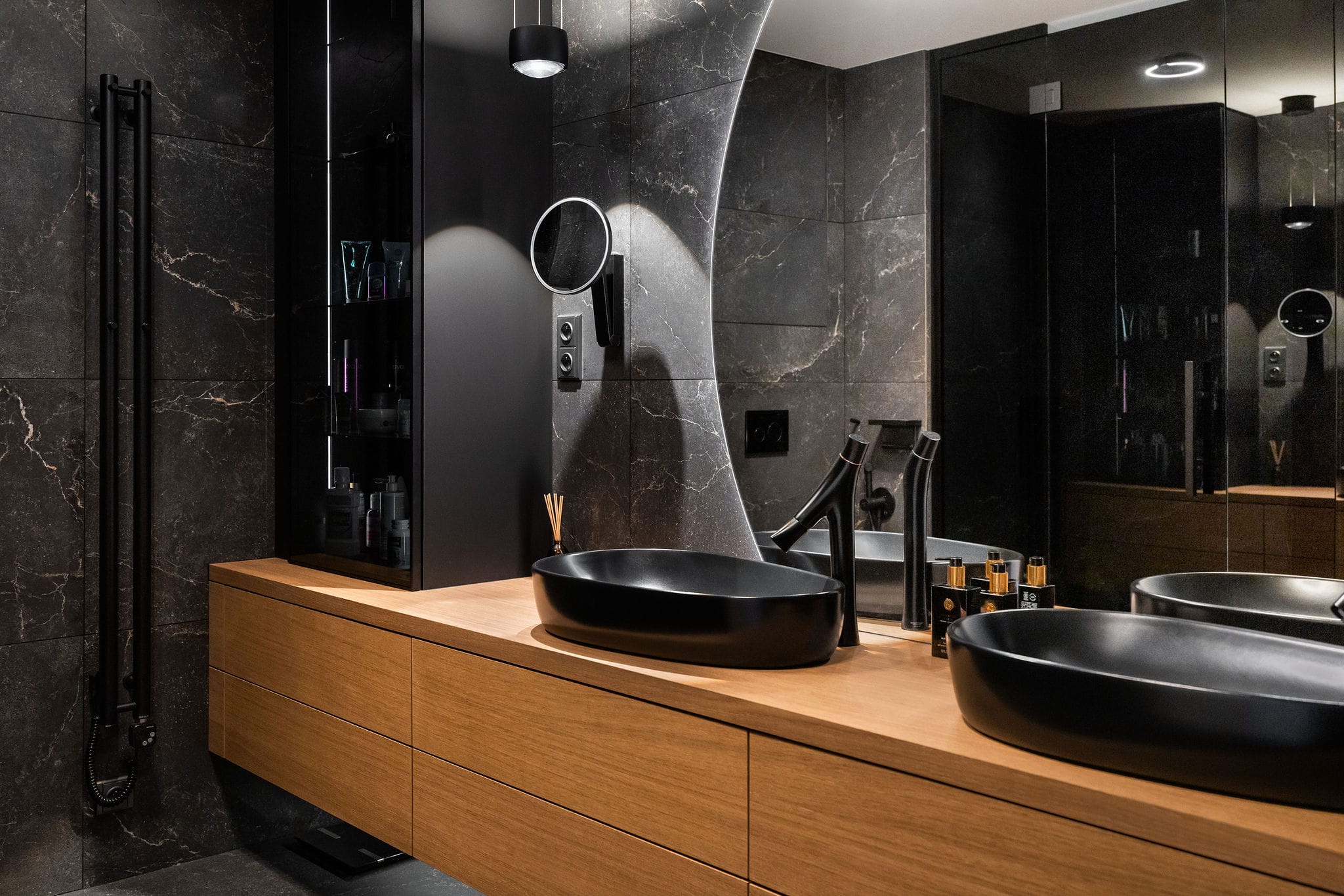 Celý interiér, včetně koupelny: Dýha dub Sundry, kartáčovaný, olej Rubio / DTDL U960 ST9 Onyxove šedá 2800/2070/18. Výsuvy BLUM Legrabox terra šedá. Osvětlení: Occhio. Mobiliář/Stůl/židle: KFF/ASCO Möebel/ Leolux. Audiotechnika: Klipsch. Obklad (TV stěna): žula Nero Assoluto Zimbabwe (patina). Obklady a dlažba (koupelna): AVA Noble Stone. Doplňky (koupelna): Hansgrohe, Keuco