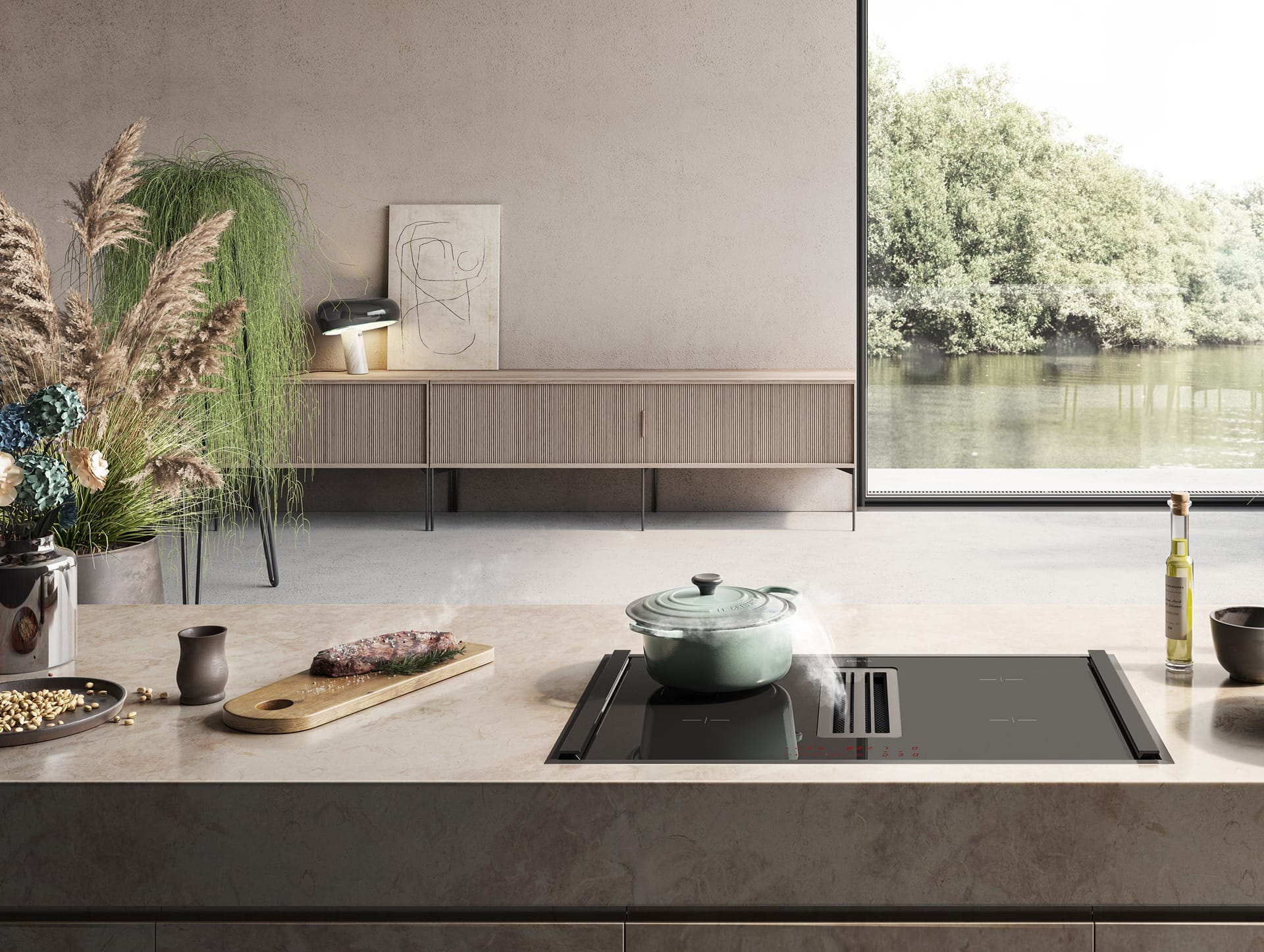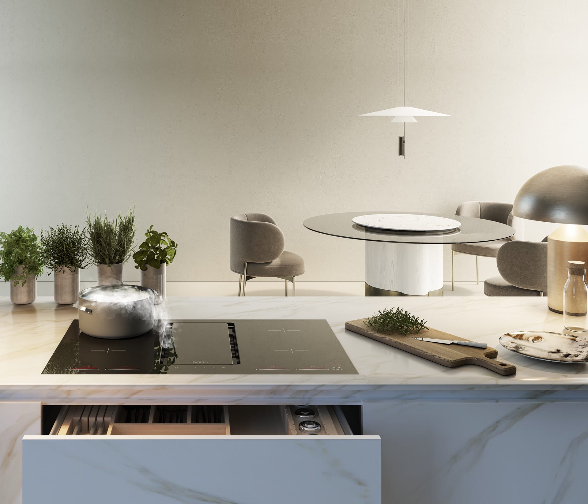 Výsledkem je indukční varná deska s funkčně integrovaným odsávacím systémem: absorbuje mastnotu, redukuje nepříjemné pachy a shromažďuje kondenzát a částice.